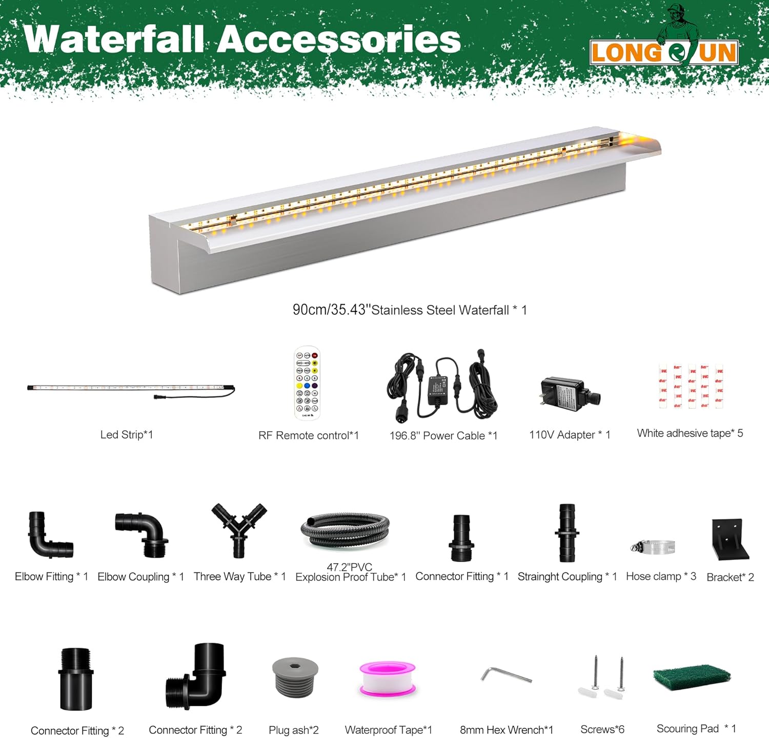 - 【DIY Decoration Pool & Pond fountain】LONGRUN waterfall spillway will make a decorative addition to your garden patio pond or swimming pool, it makes them more elegant, fashionable and beautiful. The color change of LED lights and the gentle sound of water running make your patio more special at night