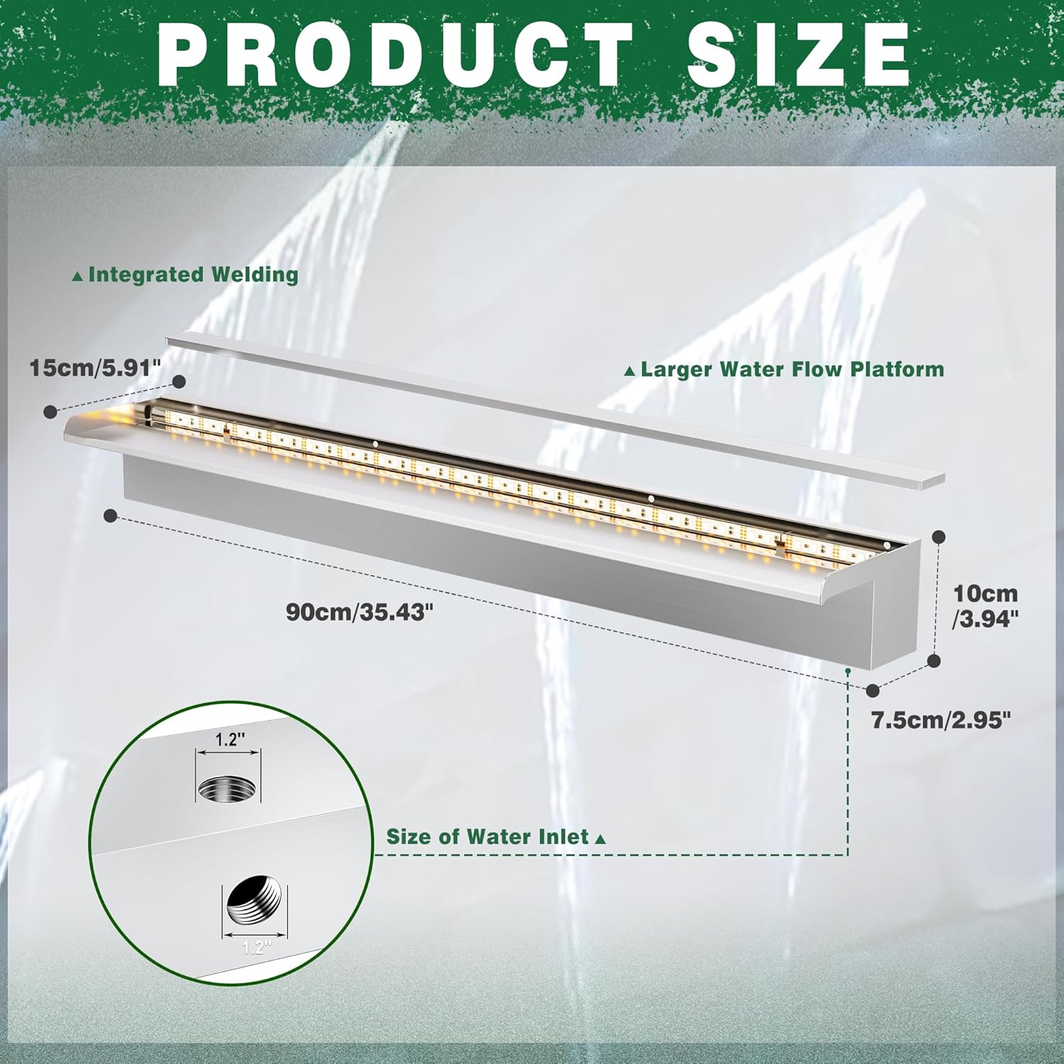 - 【Stainless Steel Waterfall】 The main body of the stainless steel waterfall spillway is welded together using 304 stainless steel, providing durability for long-term use, ensuring rust-proof and no water leakage. The open lip design creates an elegant, invigorating freefalling water effect for your swimming pool or pond