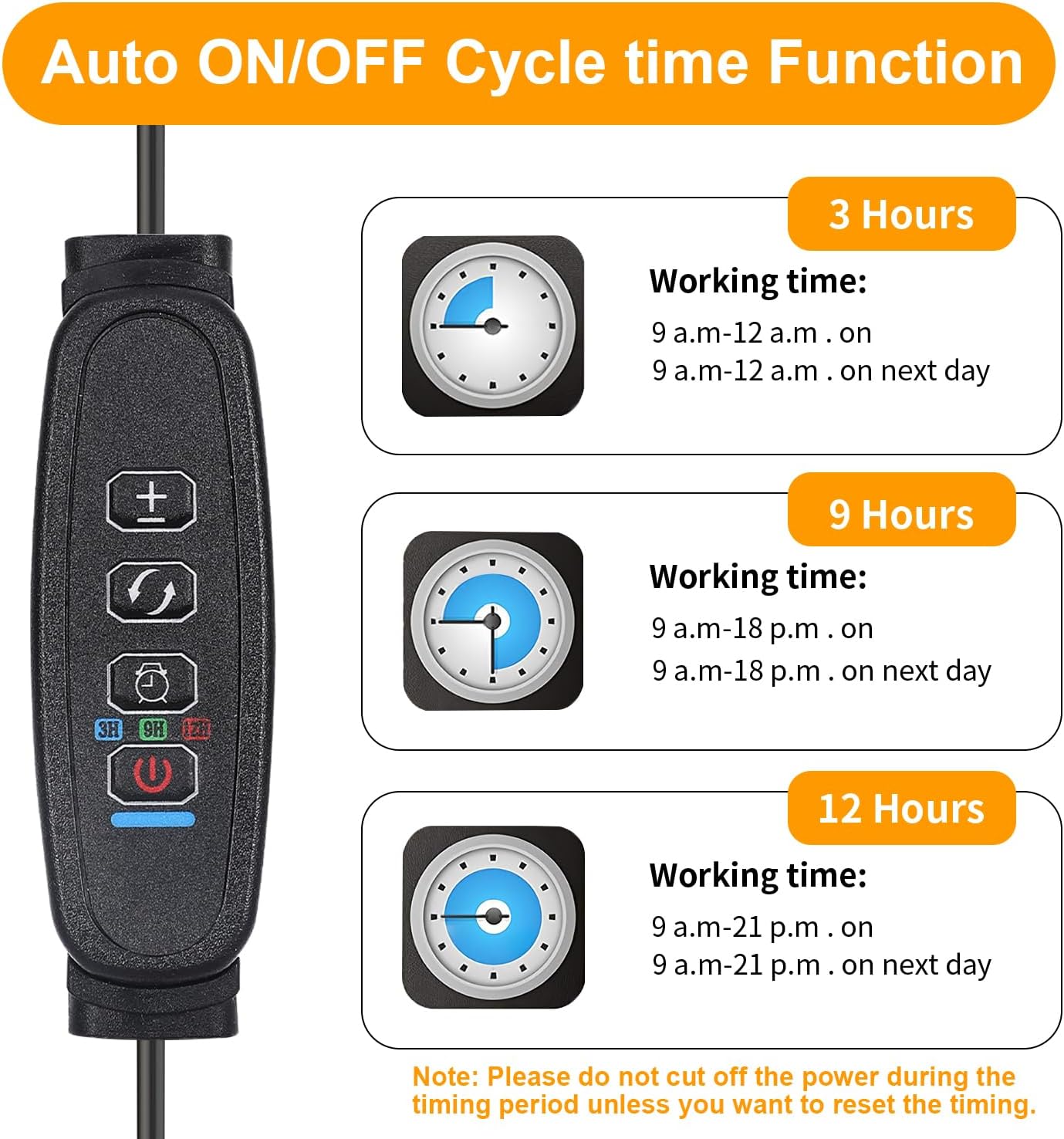 - 【Auto On/Off & Timing Function】The plant grow light comes with a cycle memory timer function, which can Auto turn on/off every day according to your settings: 3/9/12 hours, the grow light will Auto turn on and off at the same time the next day, no manual operation is required, it can take care of your plants when you on work or vacation.