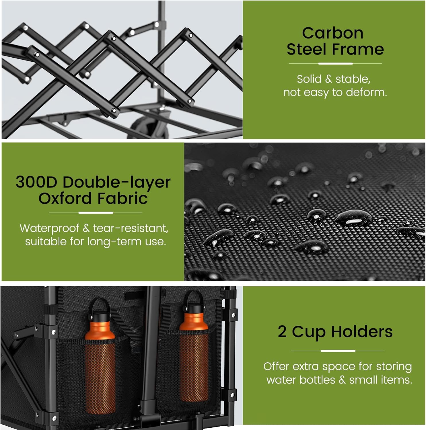 - Premium Materials & Sturdy Construction: Made with a high-strength carbon steel frame and high-quality 300D Oxford fabric, this portable wagon is built to last and is water-resistant and scratch-resistant. It can handle harsh weather and heavy loads with ease.