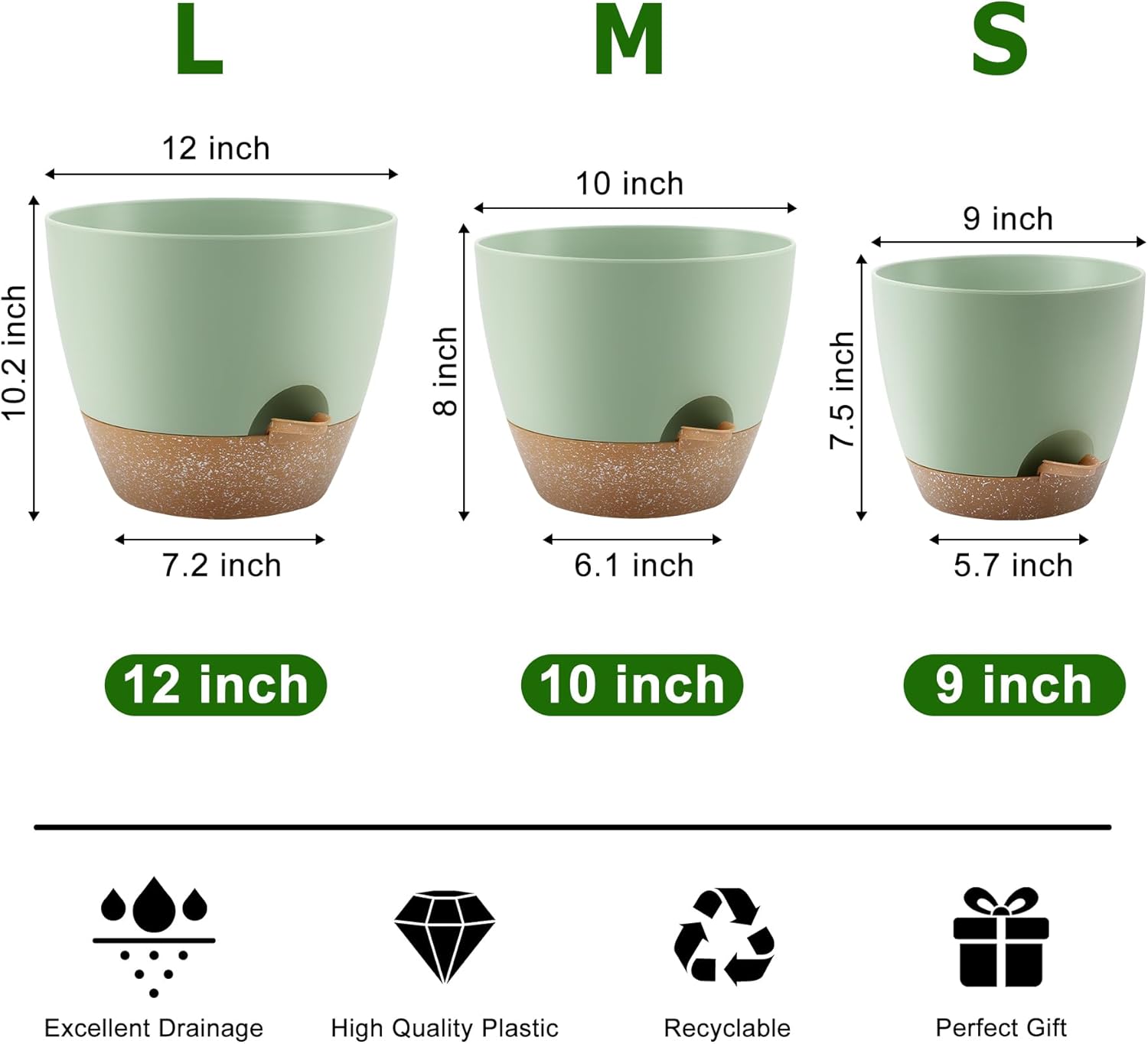 Plant Pots 12/10/9 Inch Self Watering Pots, Set of 3 Plastic Planters with Drainage Holes and Saucers,Plastic Flower Pots,Nursery Planting Pot for Indoor Out Door Plants(Green)