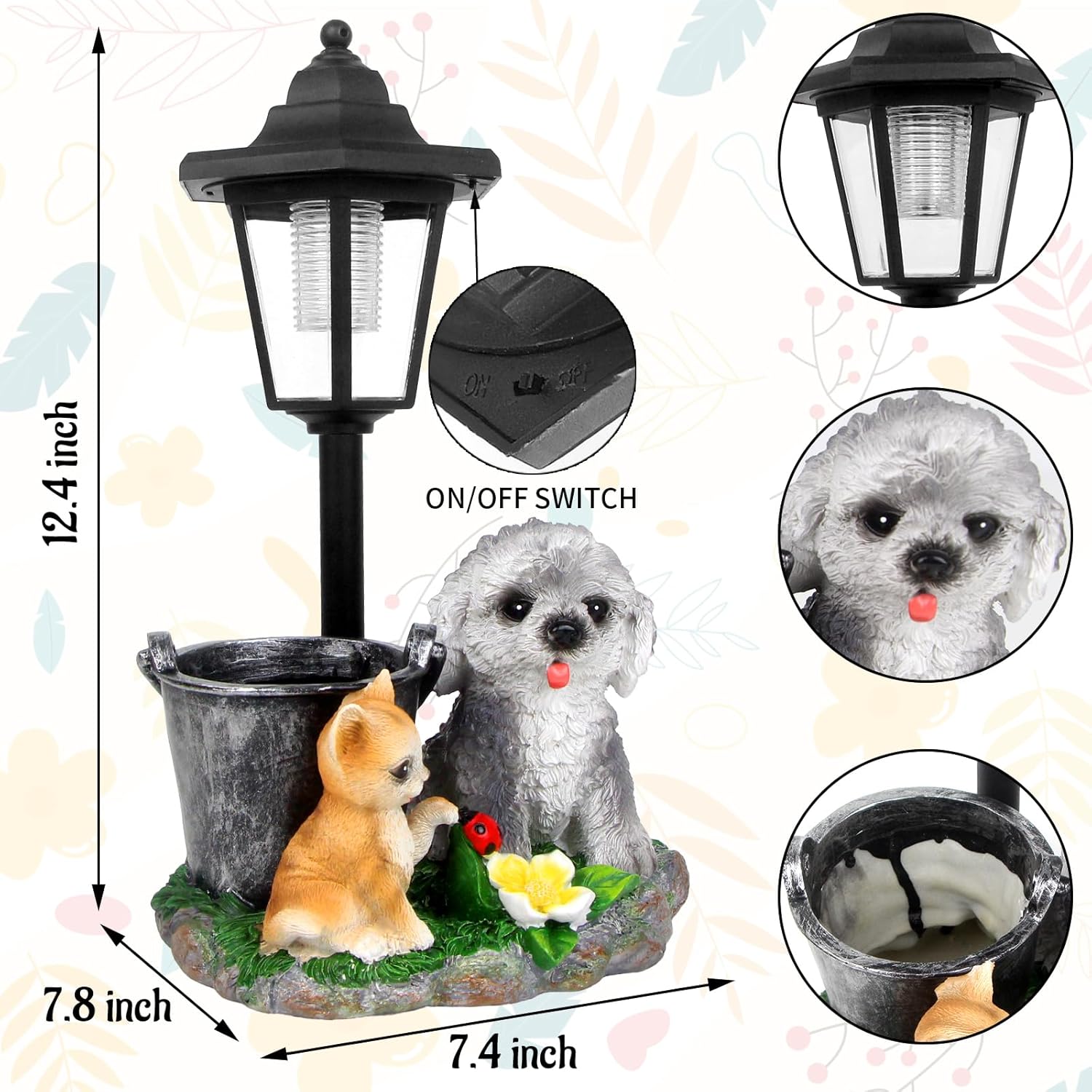 Garden Dog Statue,Resin Teddy & Cat Figurine with Solar LED Light,Flower Pots Planters Pots for Succulent,Outdoor Sculpture for Patio Balcony Yard Lawn Decor,Unique Gift for Dad Mom Grandma