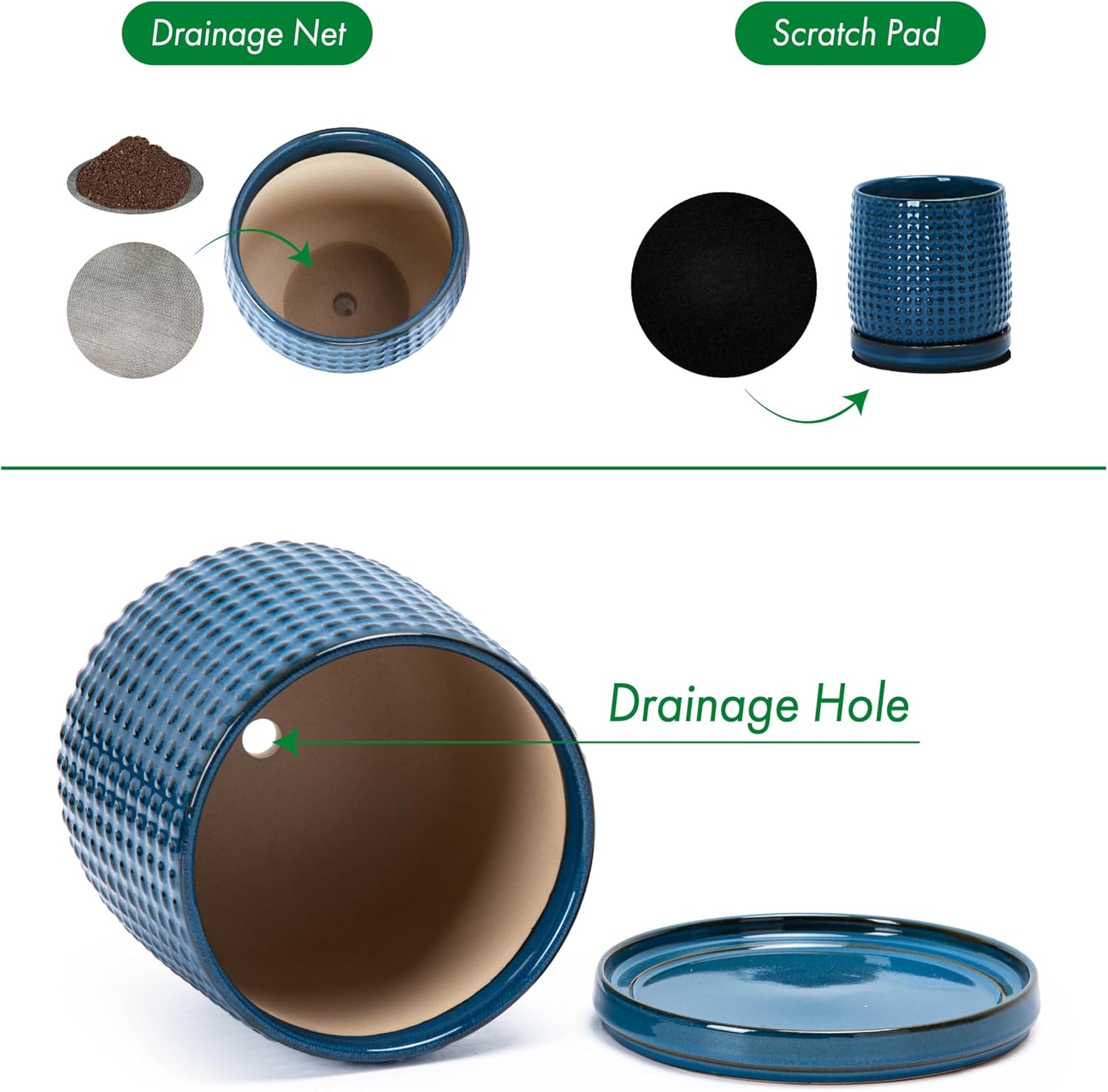 D'vine Dev Set of 2 Ceramic Plants Pots, 6 Inch Beaded Stoneware Flower Pot for Plants with Drainage Hole and Saucer, Midnight Blue, 27-E-X-3