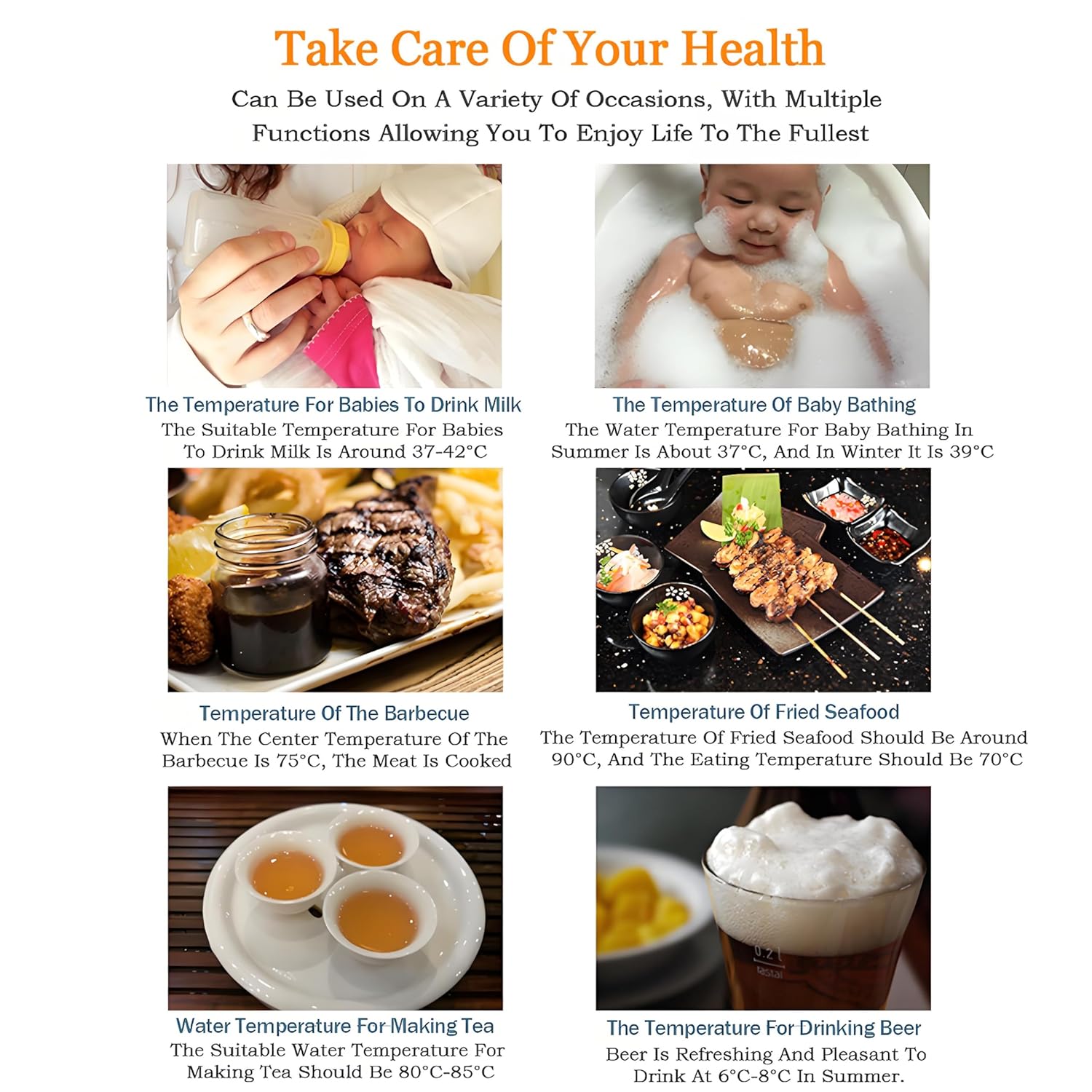 - VERSATILE APPLICATIONS: The meat thermometer is ideal for various cooking needs, including meat, liquids, frying, and candy making, providing a versatile tool for all your culinary endeavors. Simply insert the probe into the food or liquid and wait 2~3 seconds for the final temperature to be displayed.