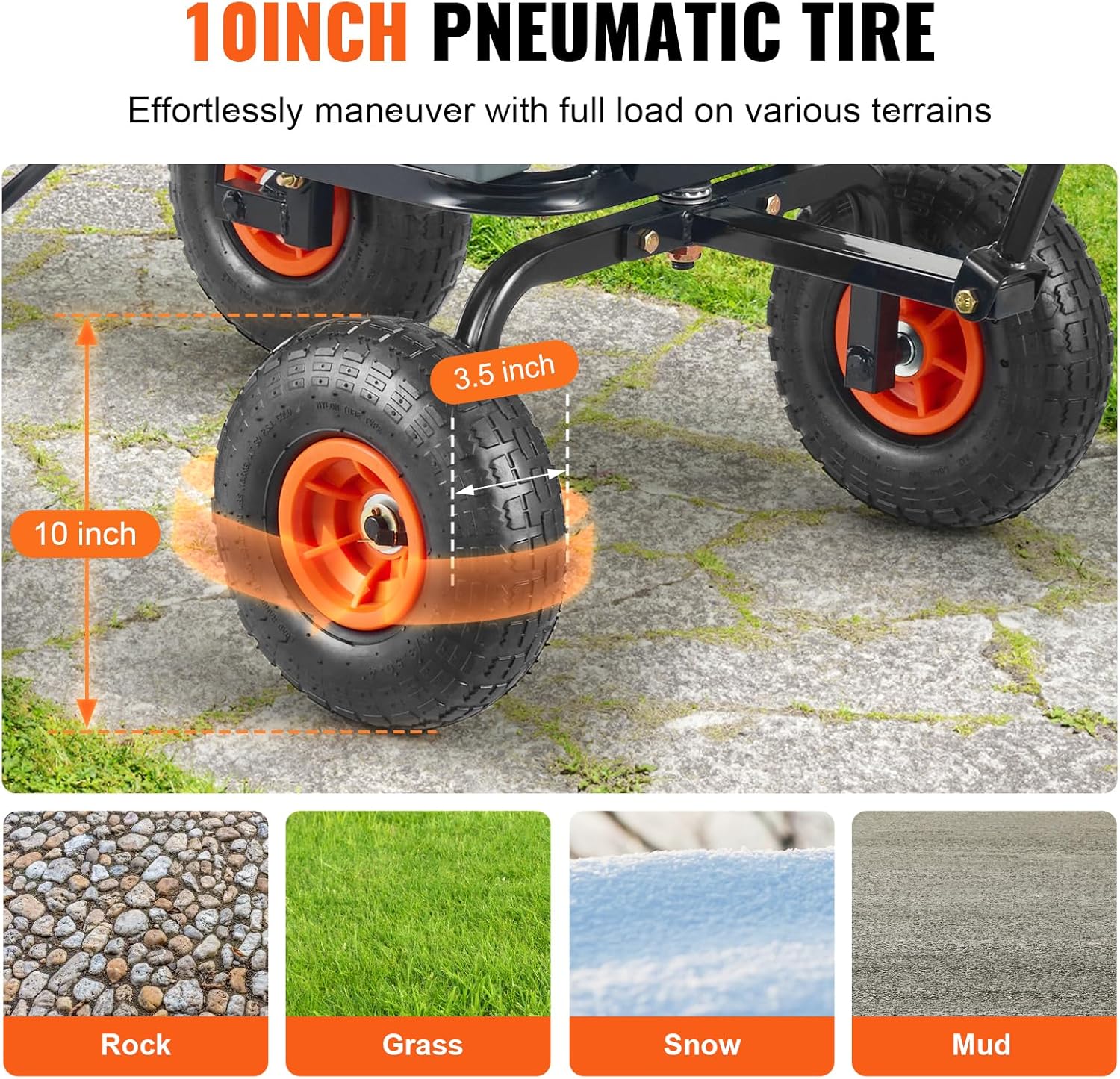 - 10in ALL TERRAIN WHEELS: With 10" rubber tires, the dump garden cart provides excellent shock absorption, navigating uneven garden terrain or grassy slopes, ensuring smooth transport.