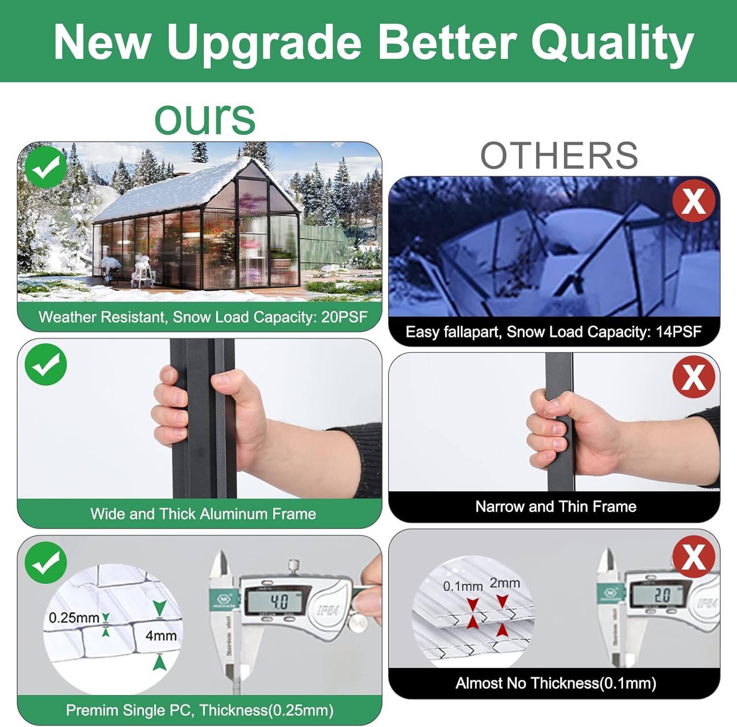 - Sturdy Frame: Our greenhouse kit boasts a robust rust-resistant aluminum frame designed to withstand various weather conditions. 2 skilled enthusiasts can assemble this greenhouse kit within just 4-6 hours. Introducing patented technology, Easy assembly, saving you 50% of your time. Gone are the days of tedious setups. With a simple push and locking screw, our Quick Connect ensures a reliable, secure, and swift link-up. It can also support snow loads of up to 20PSF.