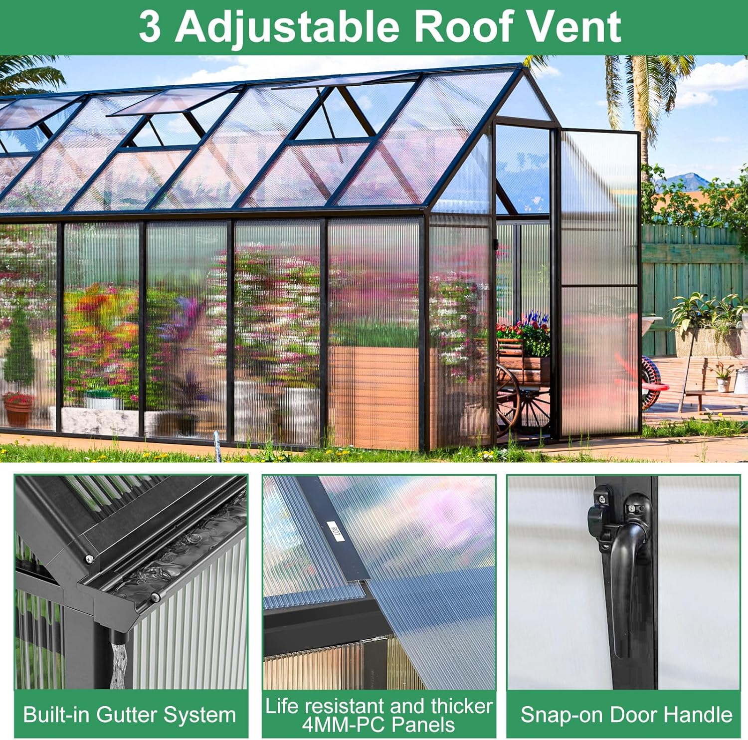- Durable Panels: These 4mm twin-wall polycarbonate panels are nearly unbreakable. They allow 70% light transmission for optimal plant growth while blocking over 99.9% of harmful UV rays. Perfectly sized for your backyard, terrace, or garden, this greenhouse is great for casual gardeners and flower enthusiasts, providing ample space for plant preparation and growth.
