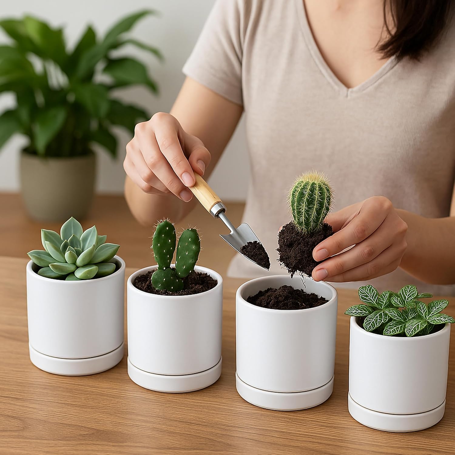 - Showcase your small houseplants or botanicals with set of 4 planter pots with saucers.