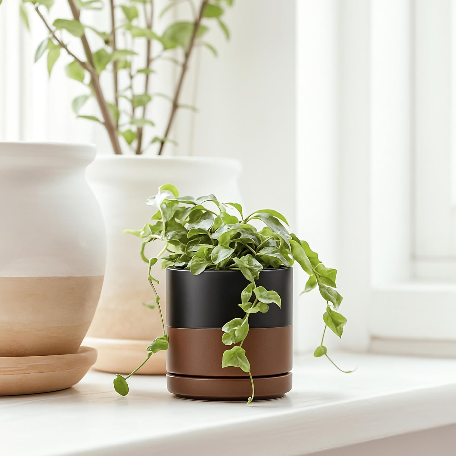 D'vine Dev Set of 2 Plants Pots, 3.5 Inch Ceramic Planter Pot for Plants with Drainage Hole and Saucer, Black/Speckled Tan, 94-V-A-7