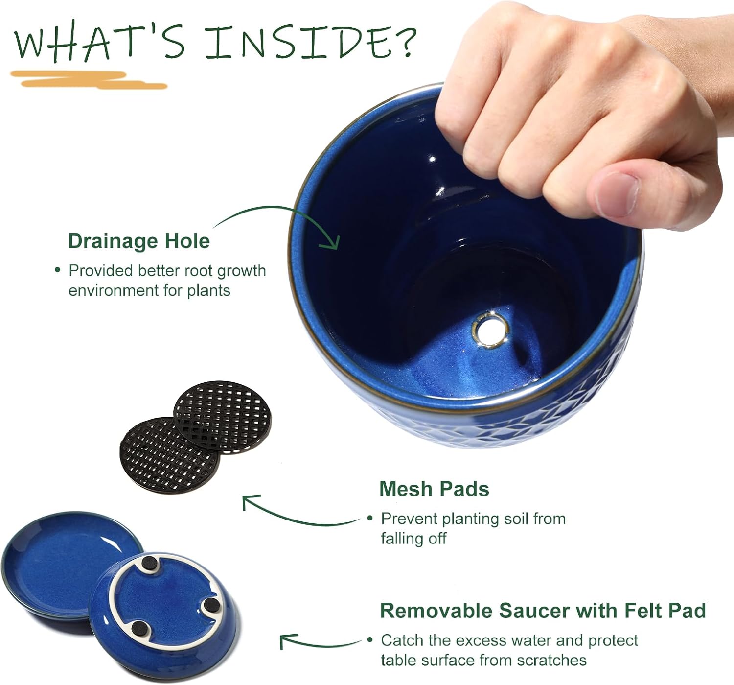 Sureasy Ceramic Plant Pots, 4.7 Inch Flower Pots for Indoor Plants, Succulent Pots with Saucer and Drainage Hole, Decorative Planter for Succulent, Cactus, Set of 4, Blue