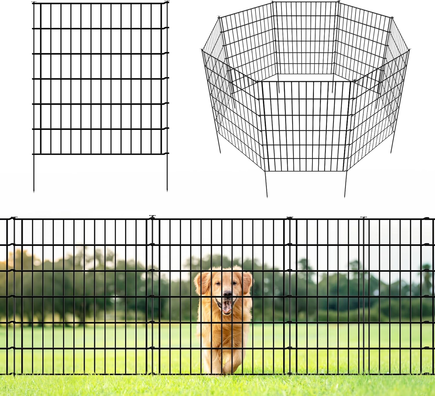 - 【Easy Installation】Installing this garden fence animal barrier is a breeze.To join two fences together, simply insert the included metal stakes into the gaps between them, and then drive the stakes into the ground. The pet fence is expandable, allowing you to easily extend it as needed. You can add more metal fence panels without limit, creating a barrier for even larger areas. The possibilities are endless!