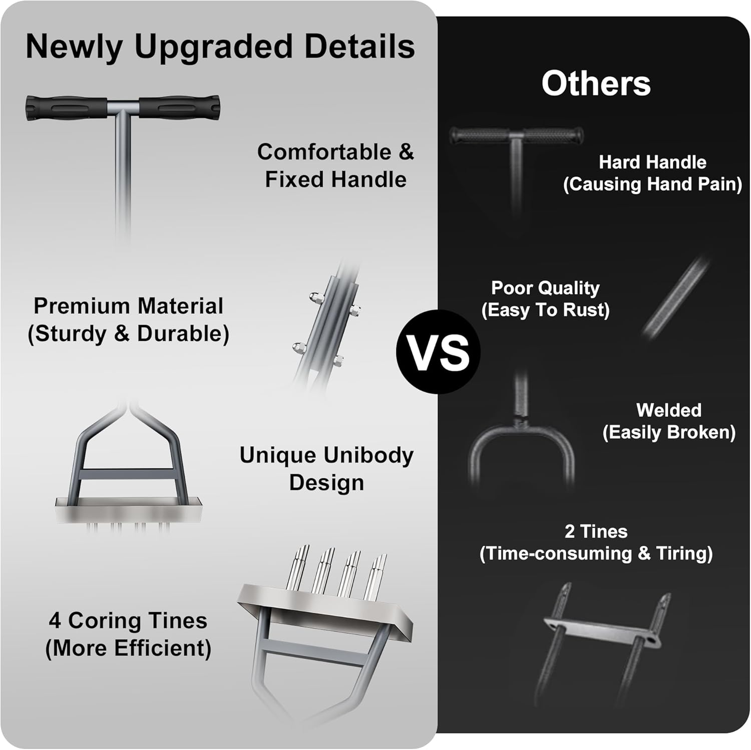 - 【Upgrad Stainless Steel Material】The Lawn Coring Aerator comes with a stainless steel bottom and core plug that won't rust or bend. More durable and stronger. The handle is made of lightweight and strong iron with an anti-oxidation paint finish.