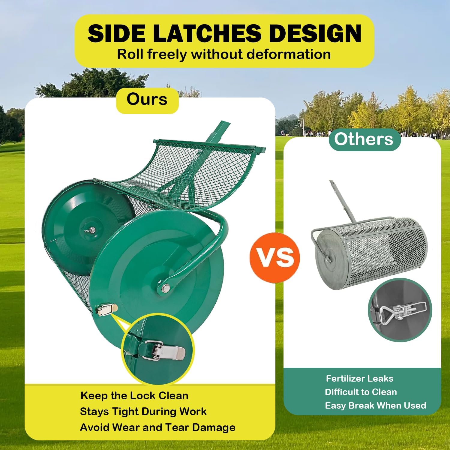 - ★Upgraded Side Latches&Support Rod★ Eagwon Peat Moss Spreader is easy to assemble and quick to disassemble. Hinged door opens and closes easily for easy filling. You will be in constant control while spreading compost! The Roller Lawn Spreader is designed with two of the latest side latches that will not be crushed during rolling on the lawn. The unique design ensures the basket remains closed during tipping and tumbling operations, making it durable and tidy.