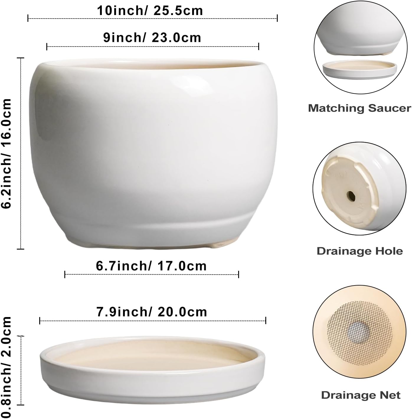 - Ideal Size: 10"D x 6.5"H, ceramic pots for plants come with a ceramic tray, drainage hole and mesh pad, plants not included, and is a nice present for plant lovers, mother, teacher, family and friend