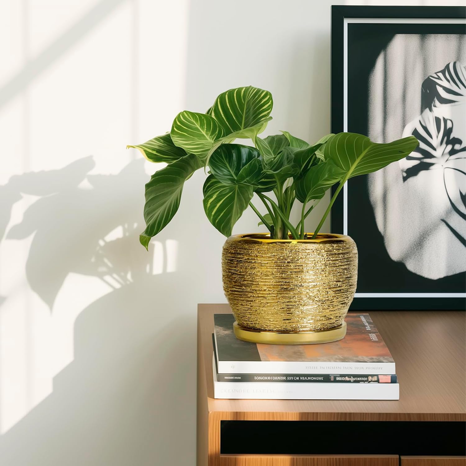 - Drainage Hole and Saucer: Plant pot indoor with drainage hole efficiently removes excess water, helping your plants thrive. The ceramic tray catches any overflow, so you can place the gold planter anywhere with confidence