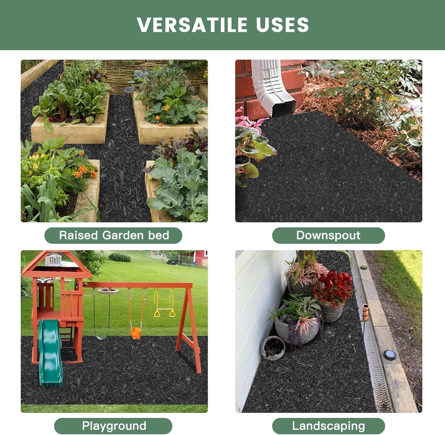 - VERSATILE: Gentle on feet and knees, not only can it be used as a pathway, weed barrier and to cover muddy areas, rubber mulch also can be placed between raised garden beds, in drainage areas, in outdoor play areas, around pools, on slippery slopes and more.
