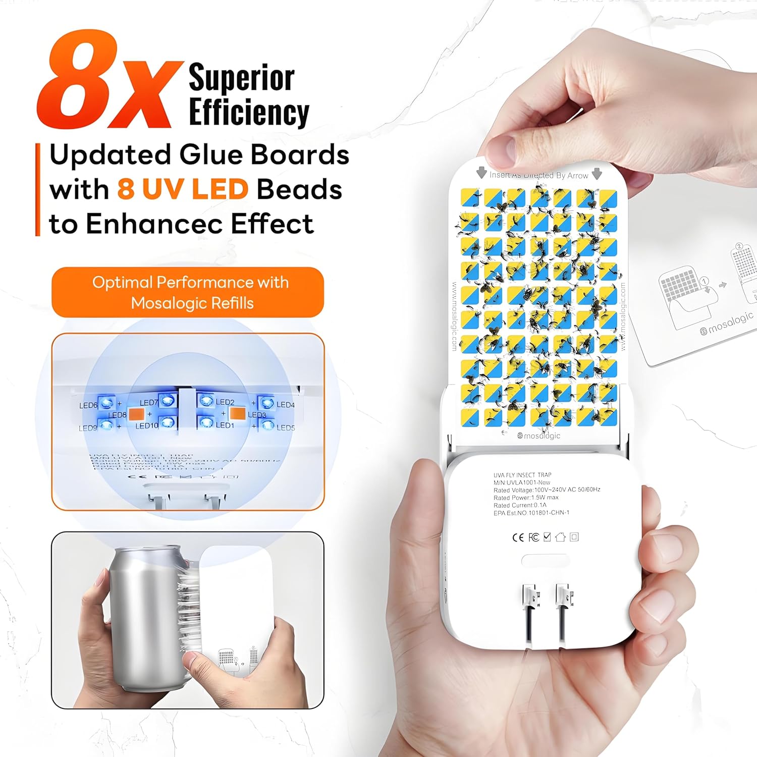 - Powerful UVA Fly Trap: Experience 8x the effectiveness with our mosquito killer that applied 8pcs upgraded UV LED beads to lure a variety of flying pests including fruit flies, gnats, moths, mosquito and more. The enhanced adhesive board ensures they're caught and stay caught for unmatched pest control.
