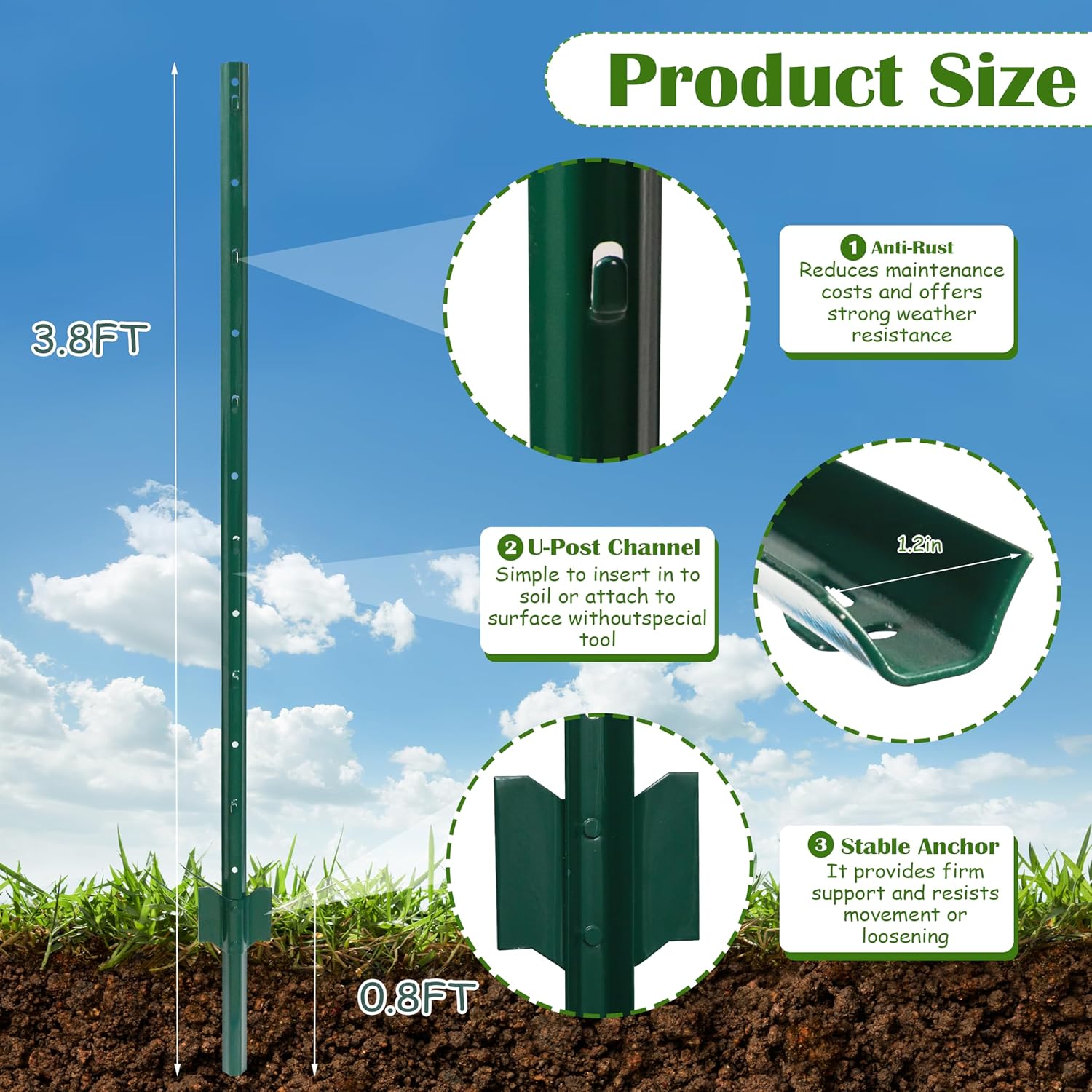- 【Superior Metal U-Post】Our durable 3.8 ft U-post is crafted from high-quality steel, offering exceptional resistance to bending and coated with a green rust-resistant finish. This design allows for prolonged outdoor use without deterioration. It provides lasting durability for your gardening or farming fence needs.