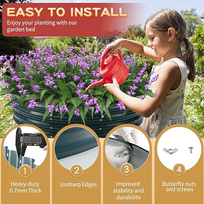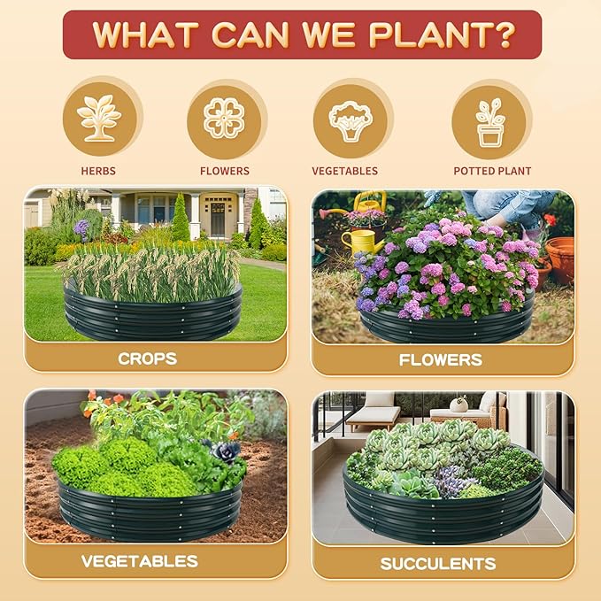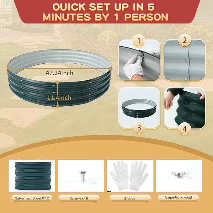 - 【DURABLE & STABLE】: ZBZBML round raised garden bed (4×4×1ft) is 47 IN Diameter,11.8IN Tall, each is made of 0.7MM thick Q195 galvanized metal sheet painted, double-layer anti-corrosion galvanizing and round structure design,it is built to providing a solid foundation for your plants.