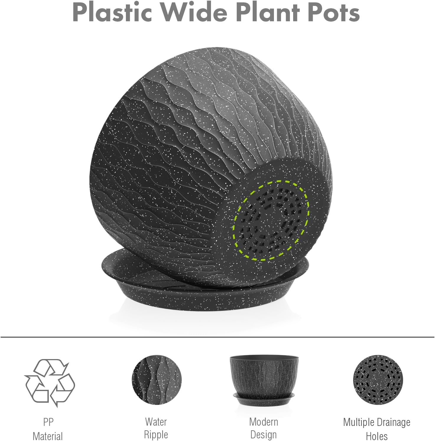 12/10/9 inch Large Flower Pots, 3 Set Big Plant Pots for Outdoor Indoor Plants with Water Ripples, Wide Plastic Planters with Drainage Holes and Saucers for Garden House Plants, Speckled Black