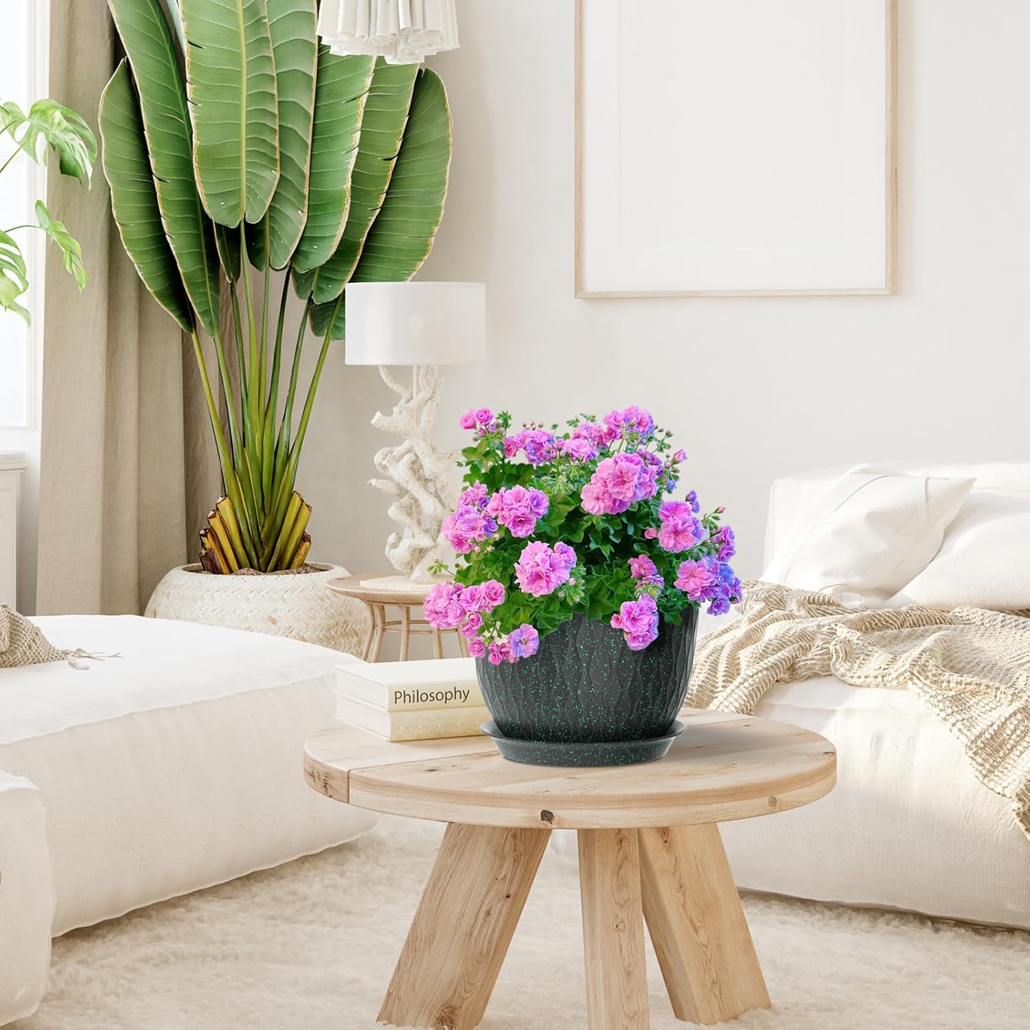 12/10/9 inch Large Plant Pots, 3 Pack Wide Flower Pots for Outdoor Indoor Plants, Water Ripples Plastic Planters with Drainage Holes and Saucers for Garden Hourse, Black with Green Speckles