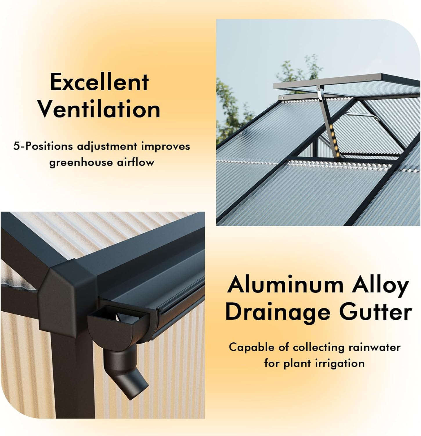 - OPTIMAL AIRFLOW AND DRAIN DESIGN – With adjustable ventilation windows and a lockable door, this polycarbonate greenhouse kit can ensure both fresh air circulation and safety for your plants. The built-in gutter system of the greenhouse roof allows for efficient rainwater drainage. So you can easily collect water for your plants. This design keeps your greenhouse cool and comfortable while providing a secure environment for your plants to thrive