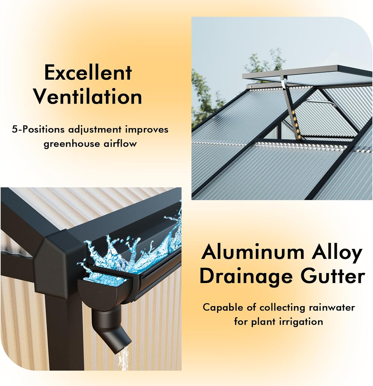 - OPTIMAL AIRFLOW AND DRAIN DESIGN – With adjustable ventilation windows and a lockable door, this heavy duty greenhouse kit can ensure both fresh air circulation and safety for your plants. The built-in gutter system of the greenhouse roof allows for efficient rainwater drainage. So you can easily collect water for your plants. This design keeps your greenhouse cool and comfortable while providing a secure environment for your plants to thrive