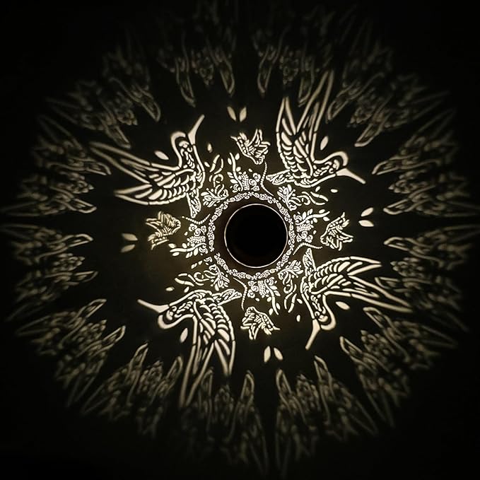 - 【Hummingbird Garden Decoration】The solar outdoor lantern is inspired by animal elements in nature. It projects bright hummingbird patterns in the dark, creating a gorgeous and warm atmosphere and bringing vitality and fun to your garden. It adopts a gold-copper color and hollowed-out metal finish, presenting a retro look.