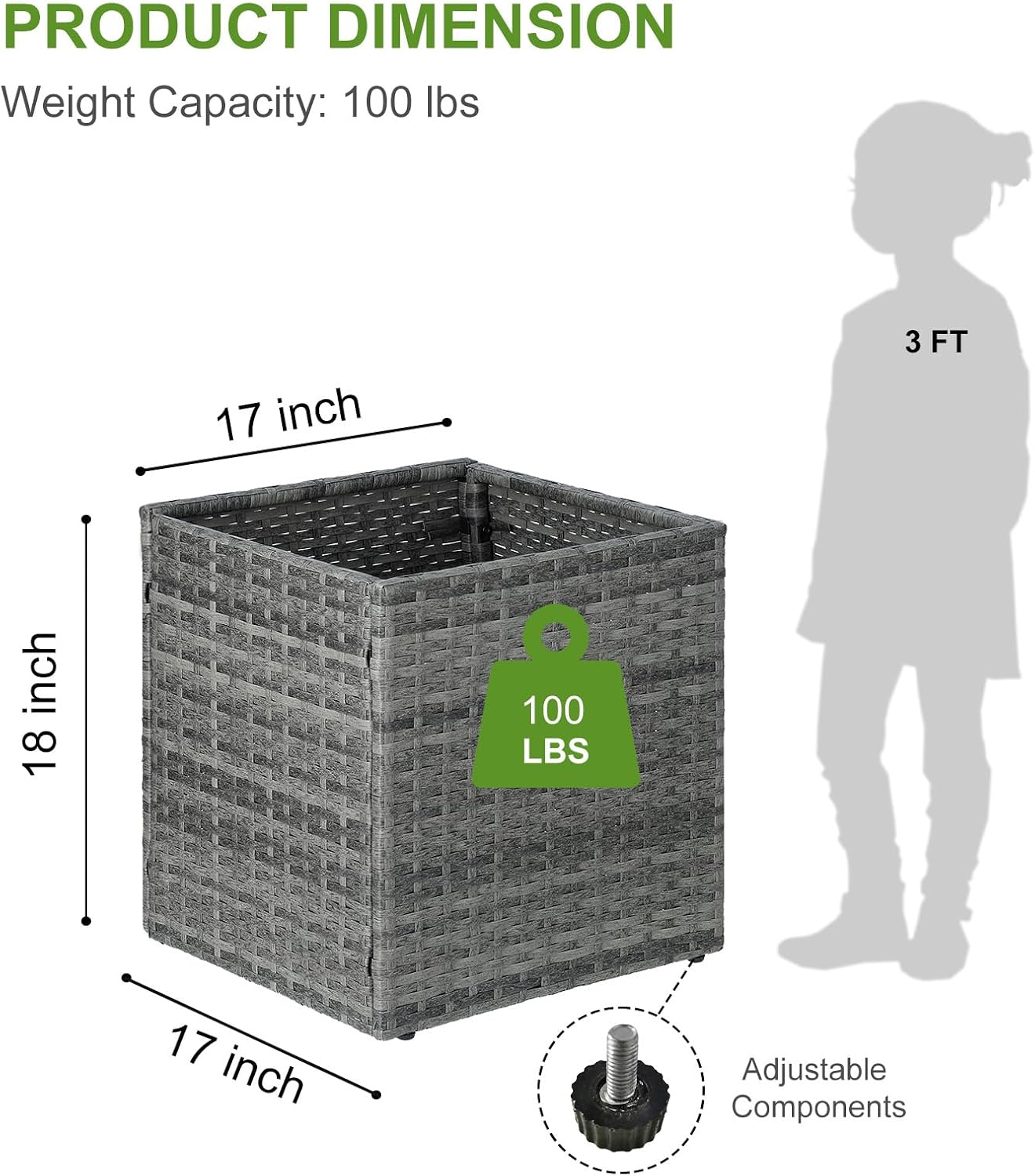 - Dimension: Measuring 17’’ L x 17’’ W x 18’’ H, this modern planter has an ergonomic height that keeps plants up and away from wild animals, making gardening easier by eliminating the need to bend over to water as usual. Available in flat packaging, easy to assemble and with detailed instructions