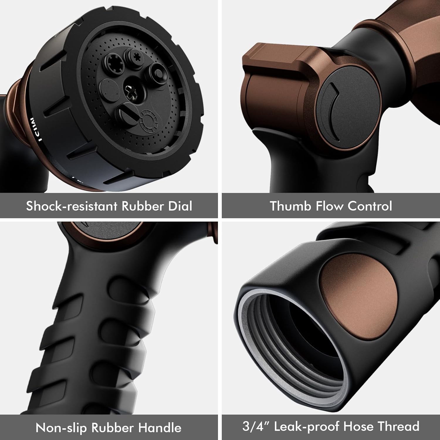 - HEAVY-DUTY GARDEN HOSE NOZZLE: The nozzle gun body is constructed with zinc-alloy material, solid & robust to resist rust, corrosion and wear. The shock resistant rubberized bezel dial can enhance durability & flexibility and withstand hard impacts & heavy force in daily drops and shocks. It is much stronger, more durable and long-lasting than plastic water nozzles.