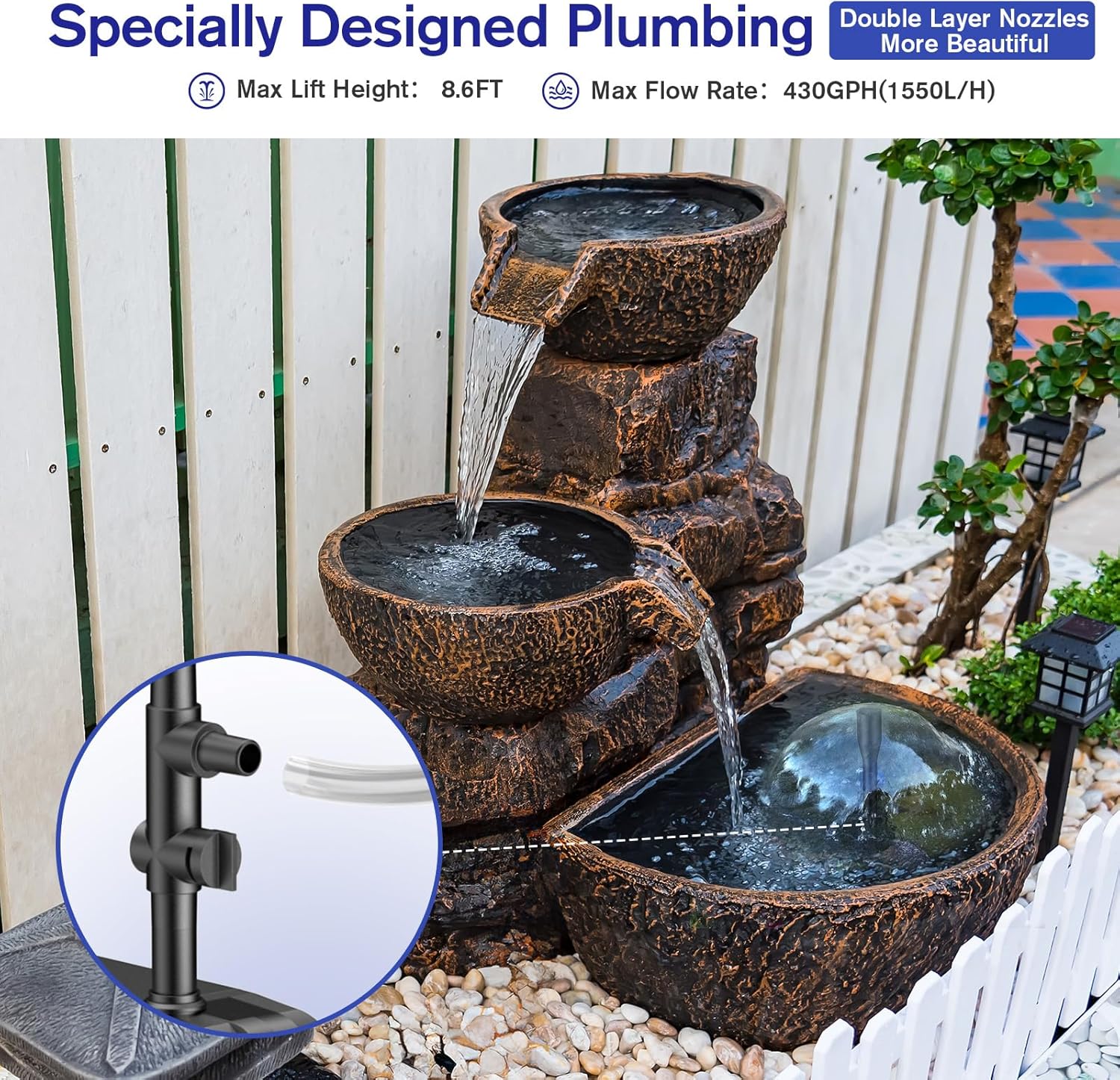 - ⛲【Upgraded Diverter Valve to DIY】The solar water pump equipped a upgraded diverter valve, meaning you can create fountain and water features at the same time. The solar powered fountain pump with 4 different nozzles to show different jet shapes meet your needs. Perfect for water circulation system water feature to attracting elk, squirrels, hummingbirds, bees and other cute animals coming to your yard!