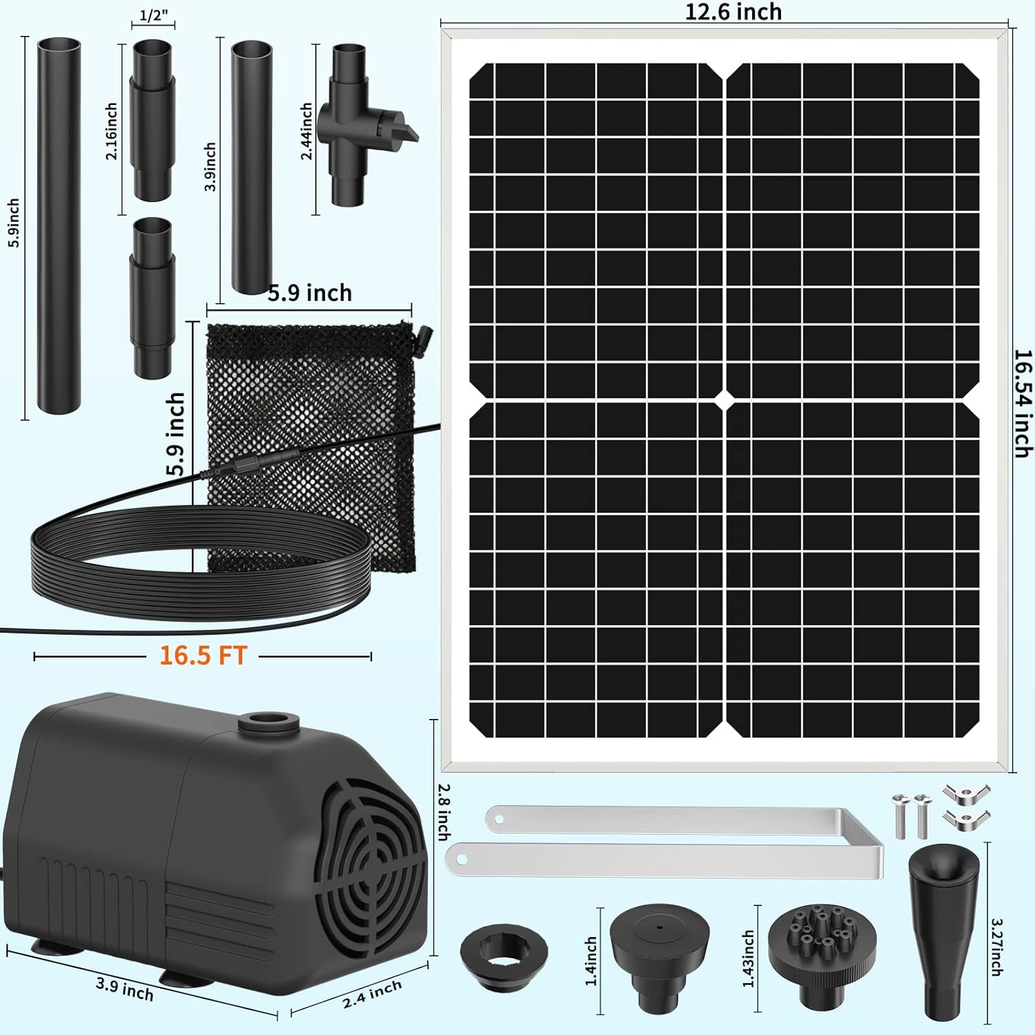 - [Easy to Use & Wide Application] The solar fountian pump is solar-powered, no need run wires across your yard and no electric bills, it starts running once pointed at the sun. Perfect for use in ponds, fountains, pools, waterfalls, hydroponic, irrigation systems and water features. The solar pump comes with mounting bracket and 16.5 ft cord length giving you flexibility in mounting.
