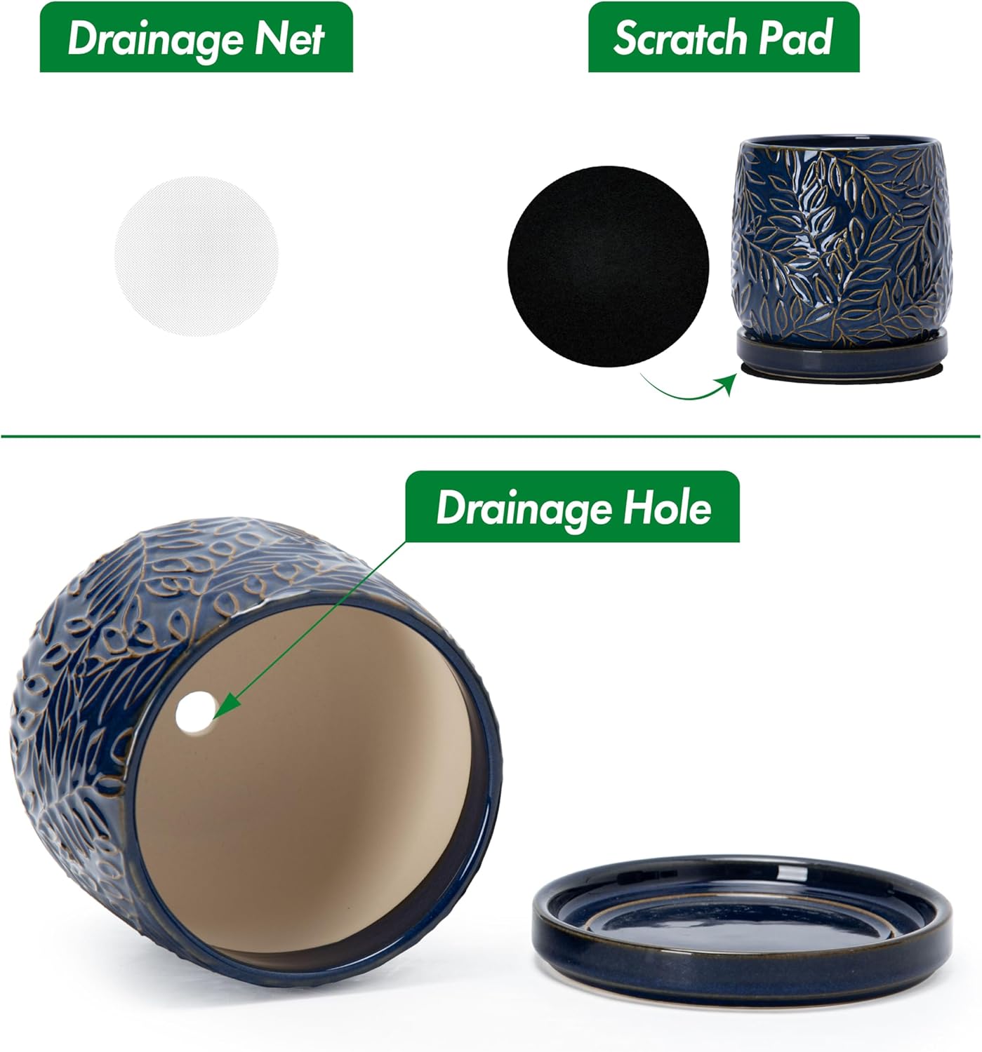 D'vine Dev 4 Inch Embossed Leaves Stoneware Planter Pot with Drainage Hole and Saucer, Midnight Blue, 27-A-Z-3