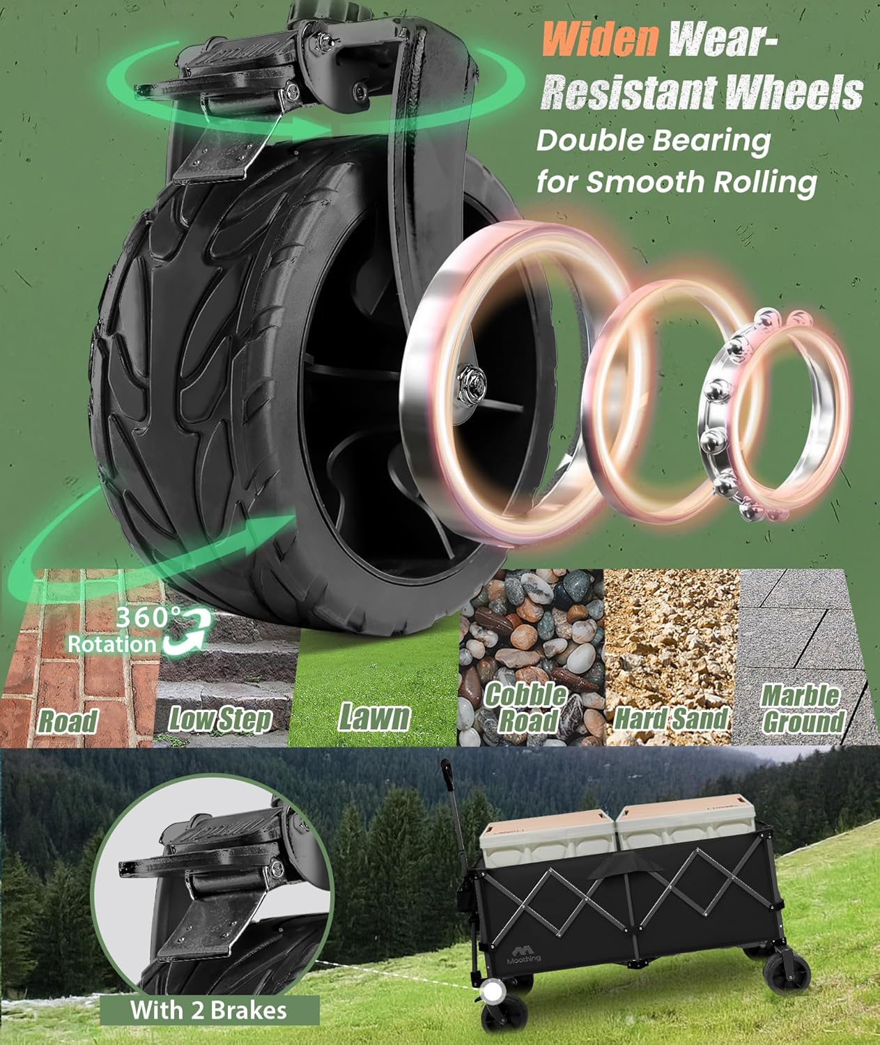 - ๐ณโณ ๐๐ฅ๐ฅโ๐๐๐ซ๐ซ๐๐ข๐ง ๐๐ข๐ ๐๐ก๐๐๐ฅ๐ฌ: Equipped with 360ยฐ big wheels, our utility wagon is designed to handle a variety of terrains with ease. The wheels come with a reliable braking system, providing you with control and safety on uneven or inclined surfaces. Whether you're navigating through your garden, beach, or a construction site, the wheels of our grocery wagons ensure a smooth ride under control