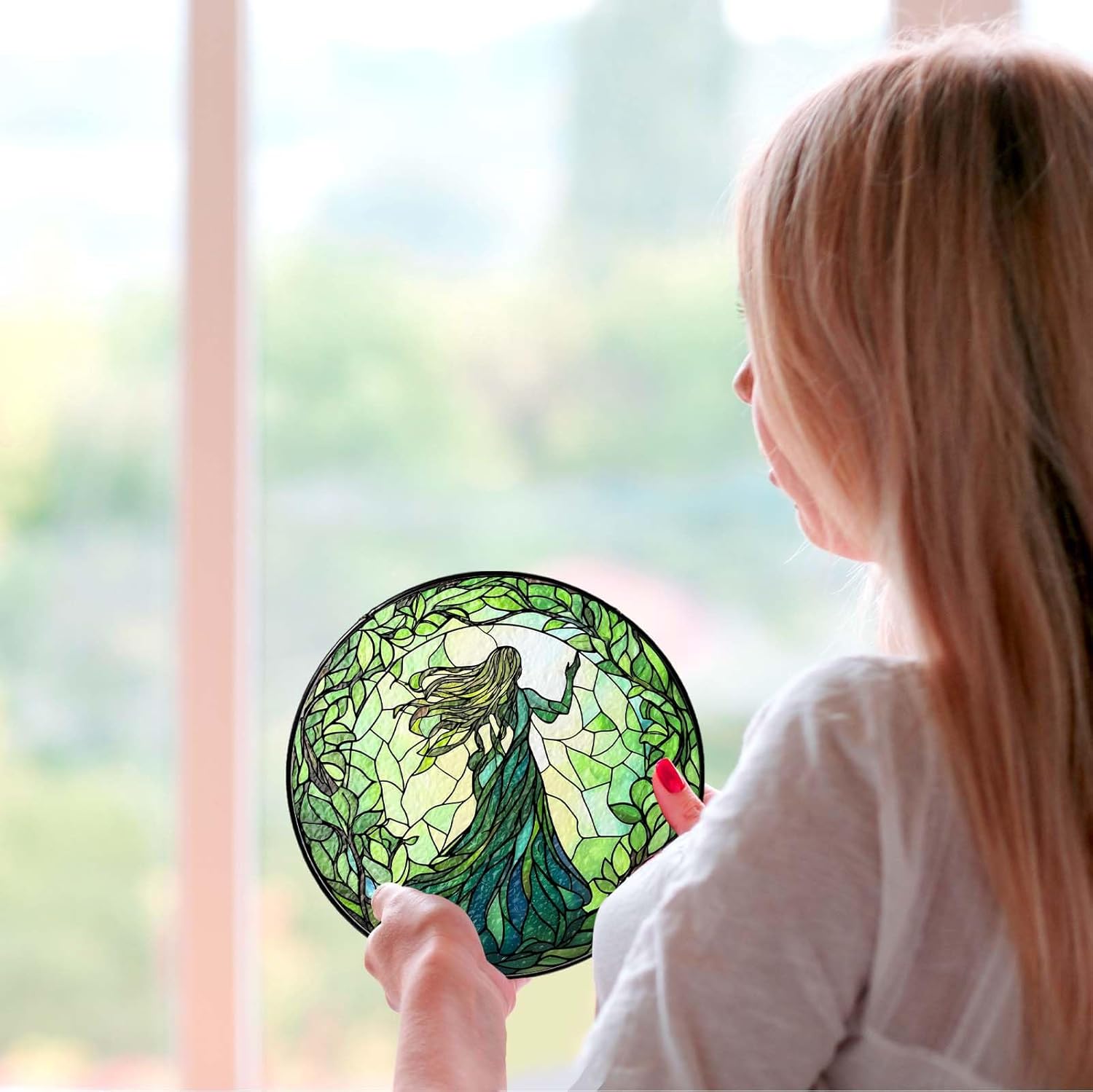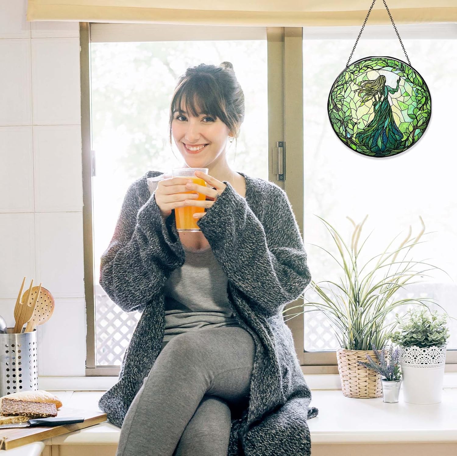 Green Witch Suncatcher Plant Witch Stained Glass Window Hanging Plant Lover Gifts for Women Wall Decor Handmade Sun Catcher Decoration for Garden Home Housewarming Gifts