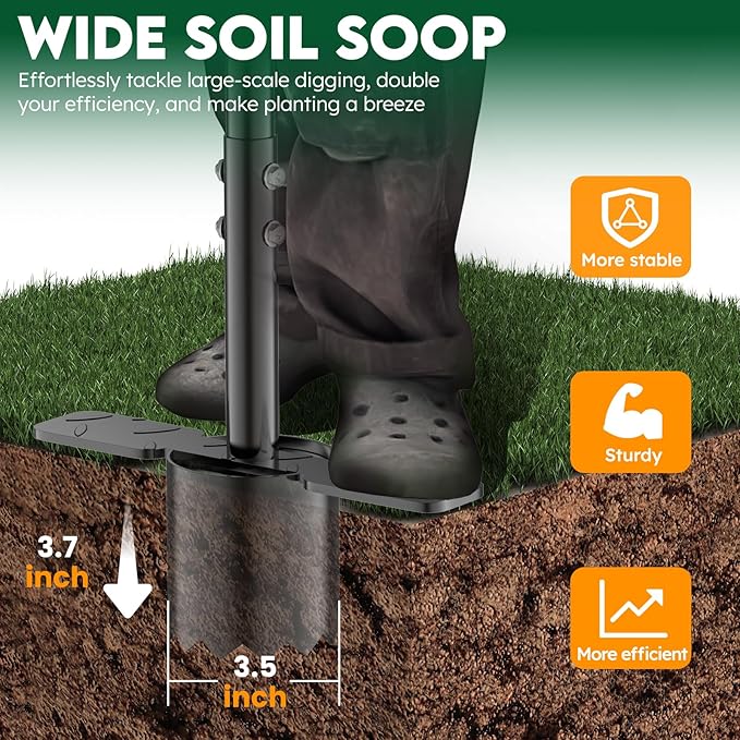 - [ Reinforced Dual Pedals ] Designed for maximum comfort and efficiency, our bulb planter features widened dual pedals with anti-slip treads for a more comfortable experience. The middle pedal allows you to dig deep with ease, while the raised pedal effortlessly releases soil. The anti-slip design ensures stability and safety, even in wet or muddy conditions.