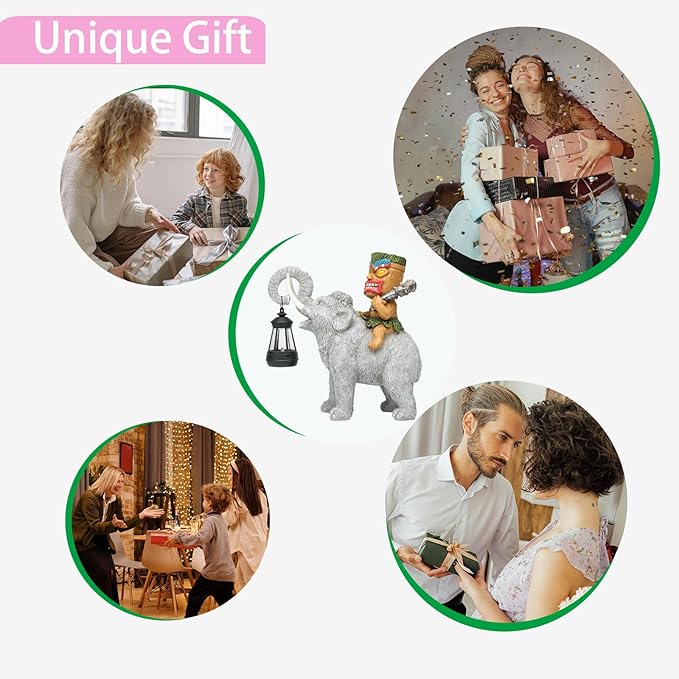 Solar Tiki Statue-Outdoor Statues-Tiki Bar Decor-Solar Powered Light Garden Figurine Tiki Decoration for Bar,Patio,Balcony,Yard,Lawn,Table,Riding A Elephant 9.09 Inches Tall