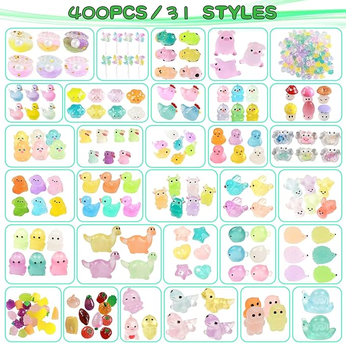 - VALUE PACKAGE:400pcs various tiny resin animals(Including 180 rainbow stones). Glowing in The Dark Fairy Garden Accessories. Which include:21 different animals, 25 fruits, 15 vegetables,mushrooms, clouds, windmills, stars, shells, etc.and all the Figurines shown in the main image.Everything imaginable. We've got it all.