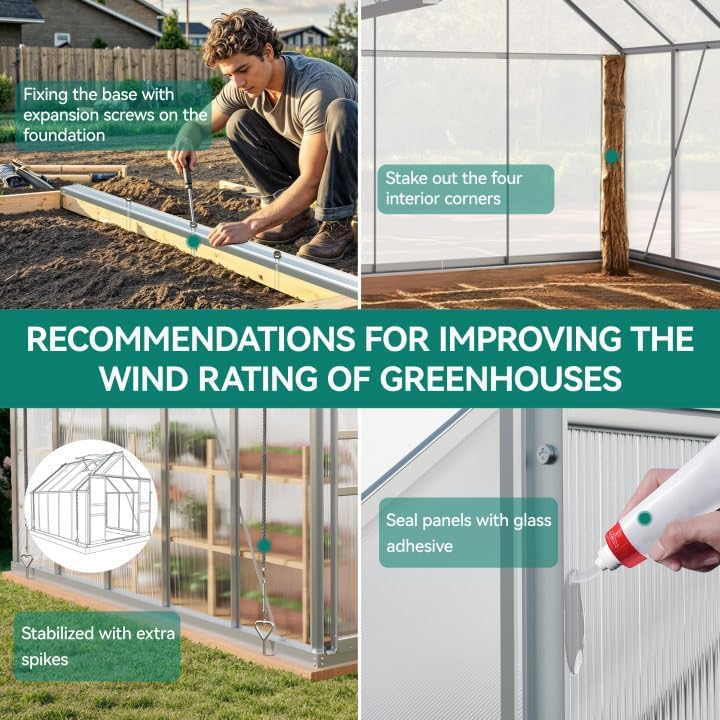 - FIXATION MEASURES- We recommend placing the bottom frame in a pre-dug trench after securing the board with expansion screws (include) to the ground for greater stability and temperature chamber wind resistance; Recommended to apply glass glue to the connection between PC board and frame for better water protection; When the weather is bad, we recommend that the precious items in the greenhouse be removed to avoid unnecessary property loss and do not use greenhouse during the time