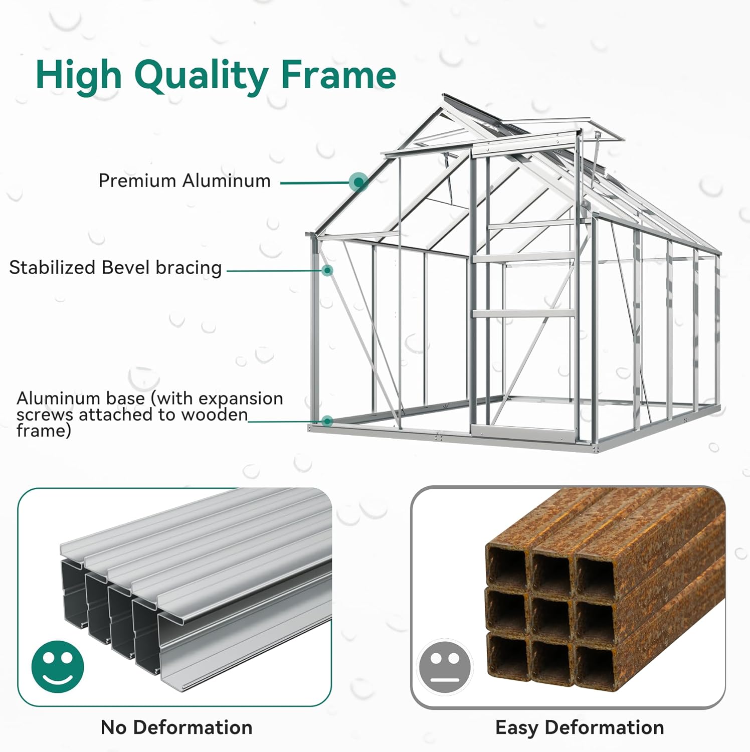 - UPGRADED MATERIALS- 6x8FT polycarbonate greenhouse is constructed using a reinforced aluminum alloy frame, along with reinforced rods on the sides and diagonal rod fixation for enhanced sturdiness and load-bearing capacity; Double-wall polycarbonate boards with 4mm UV protection effectively blocks 99% of UV radiation to protect your plants