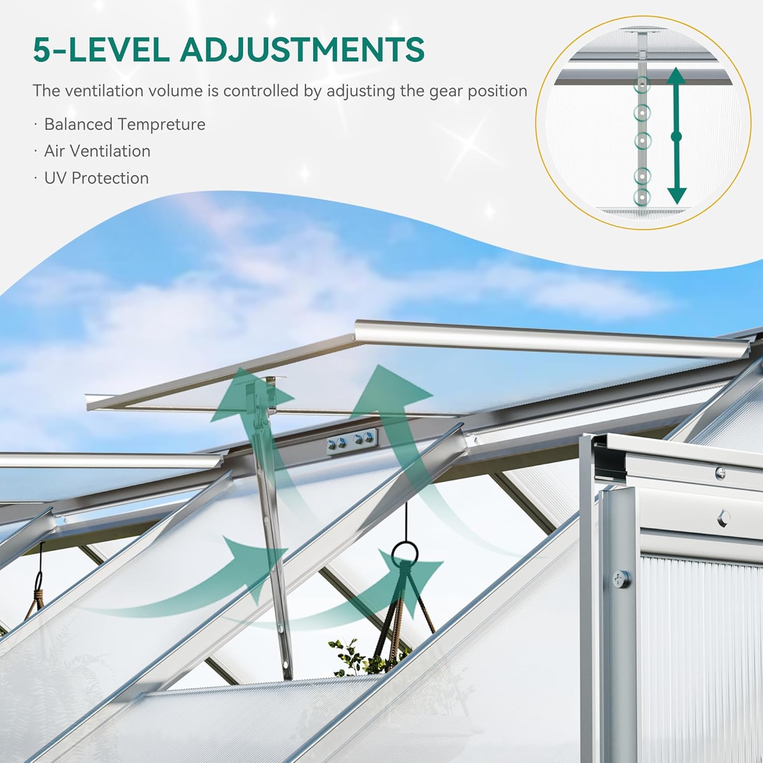 - CUSTOM ADJUSTMENT- This heavy duty green house features adjustable skylights with various opening angles available, creating optimal air circulation system to sustain indoor ventilation and cooling; Innovative sliding door allows for seamless opening and closing, and saves more space than traditional ones