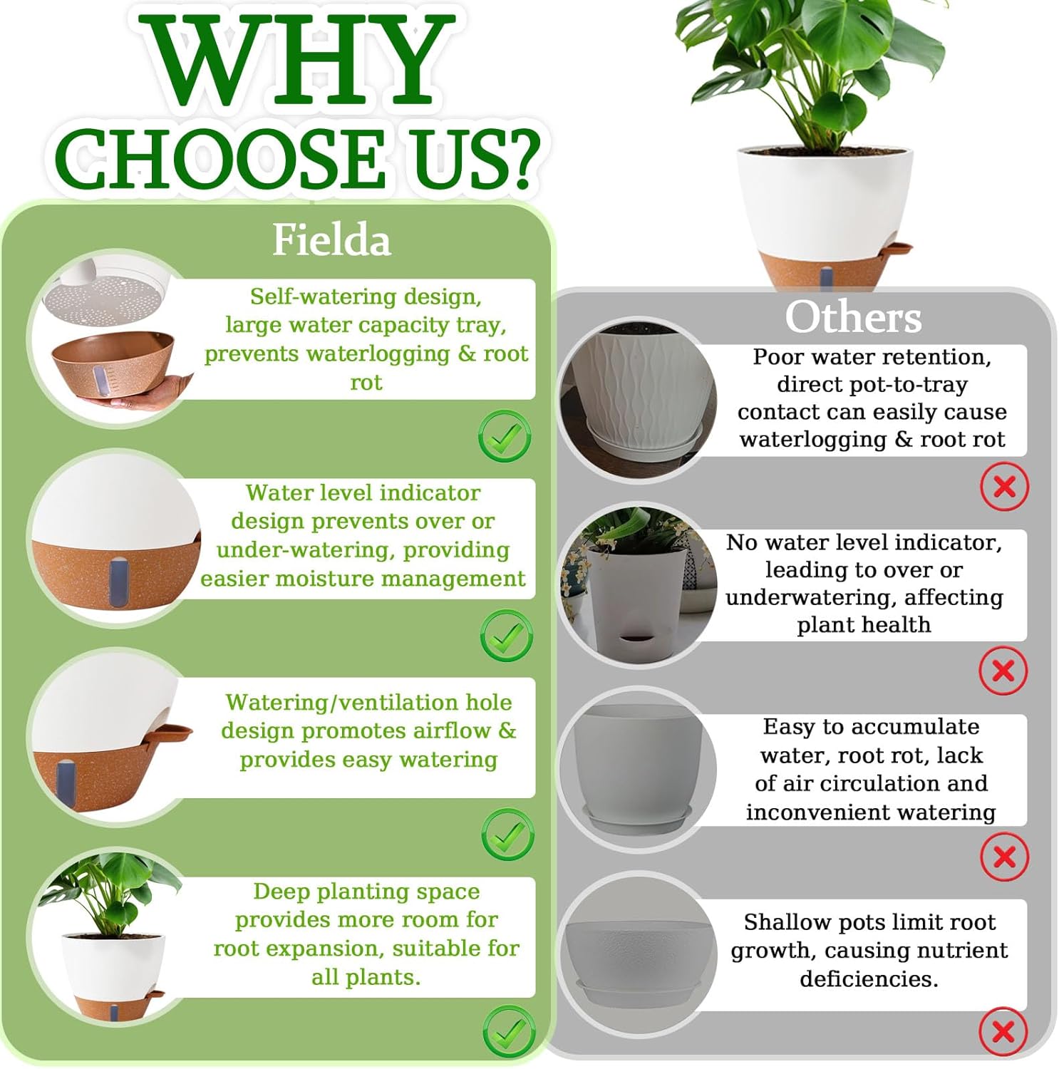 - 🌿 【Self-Watering Pots with Water Level Indicator】 Designed for busy plant lovers, our 8/10/12 self-watering pots feature a built-in ABSORBENT COTTON WICK SYSTEM that automatically draws water from the detachable bottom tray. The TRANSPARENT WATER LEVEL WINDOW WITH MEASUREMENT MARKINGS lets you monitor hydration at a glance, ensuring no overwatering or underwatering. Perfect for indoor/outdoor plants, this system keeps soil evenly moist for up to 7-10 days—ideal for vacations or hectic schedules.