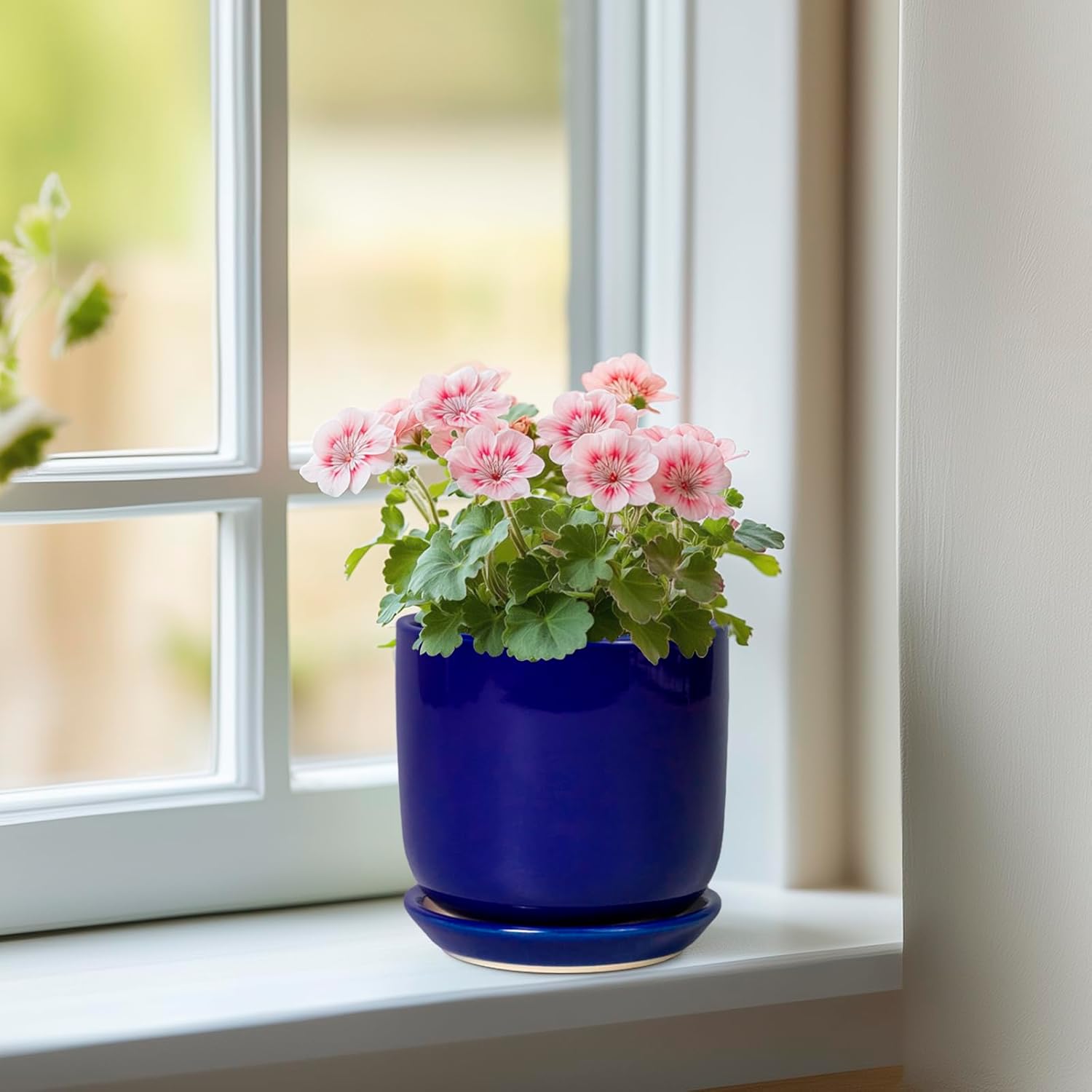 Succulent Pot 5 Inch - Modern Ceramic Planter for Indoor Plants with Drainage Hole and Saucer, Office Home Room Patio Decor, Blue