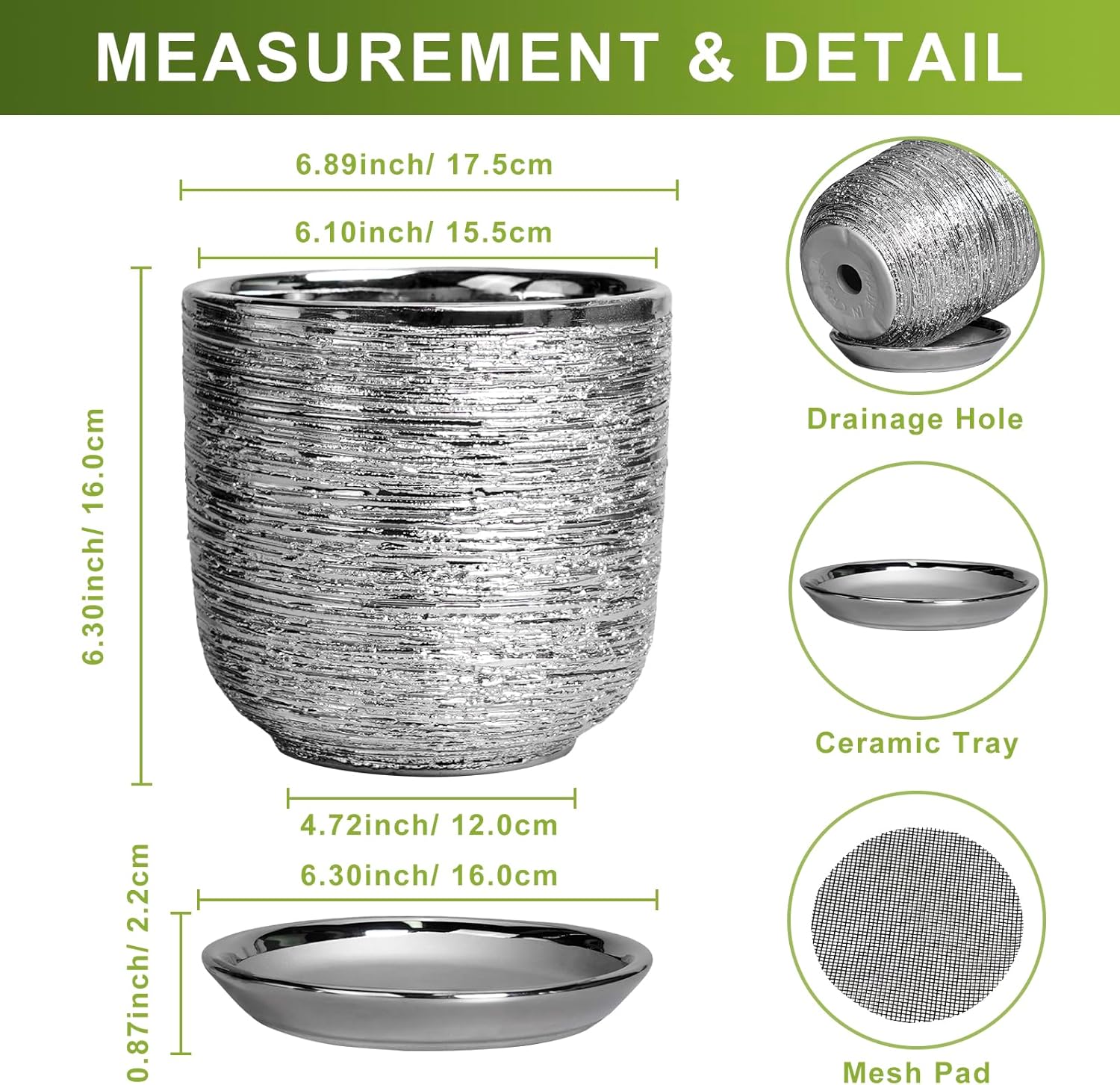 - Size of Silver Planter: Each 7 inch plant pot is 6.89” D x 6.57” H. A matching saucer to prevent leaks, allowing you to place plant pot anywhere with confidence
