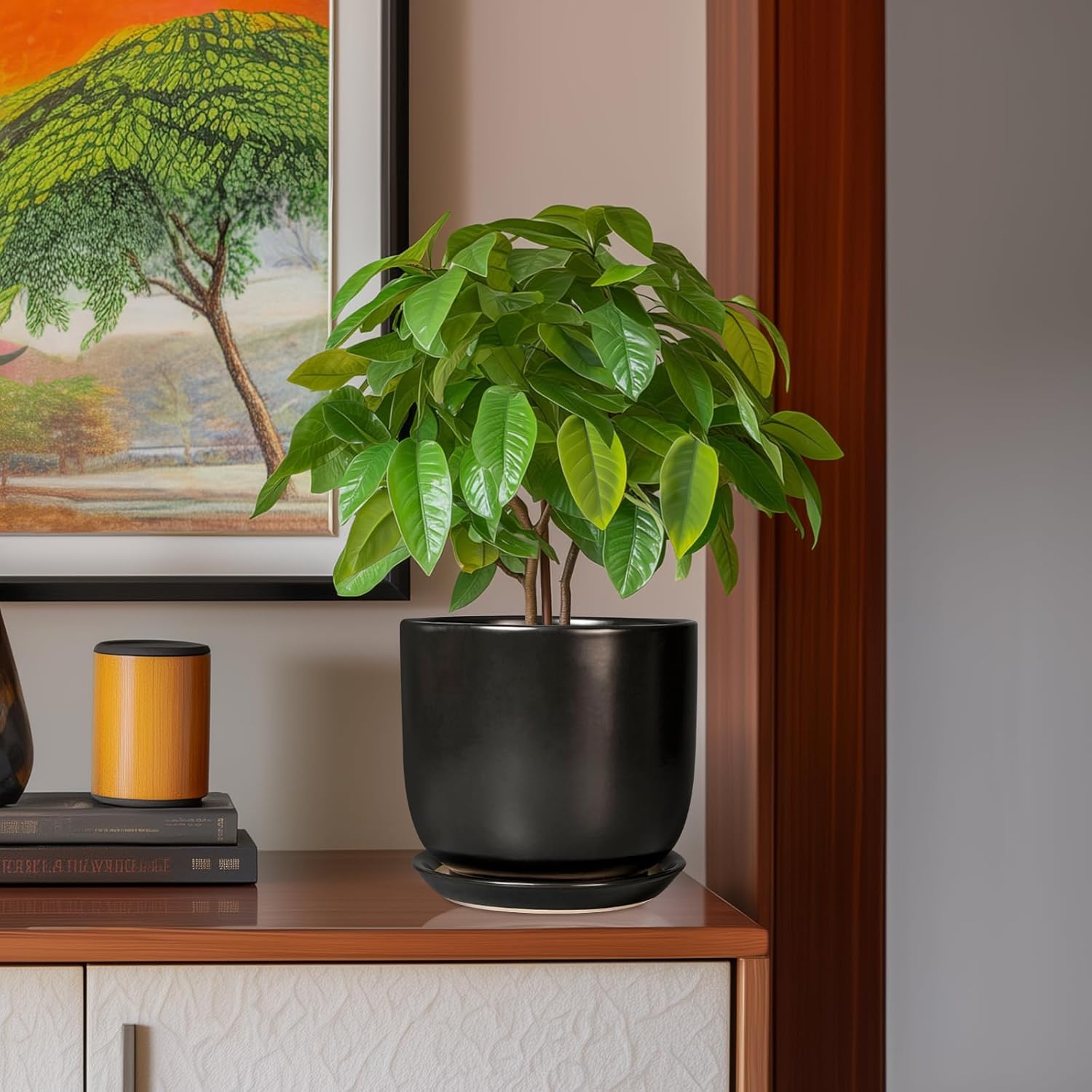 Ceramic Flower Pot 8 Inch - Modern Round Planter for Indoor Outdoor Plants with Drainage Hole and Saucer, Home House Room Office Patio Decor, Black