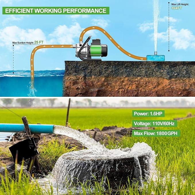 - Powerful Garden Pump: The shallow well pump features a 1.6 HP efficient capacitor motor and impeller, which ensures strong suction and provides plenty of water flow of 1800 GPH with a max lift of 164 ft. Making it perfect for various water transfer needs such as home garden irrigation