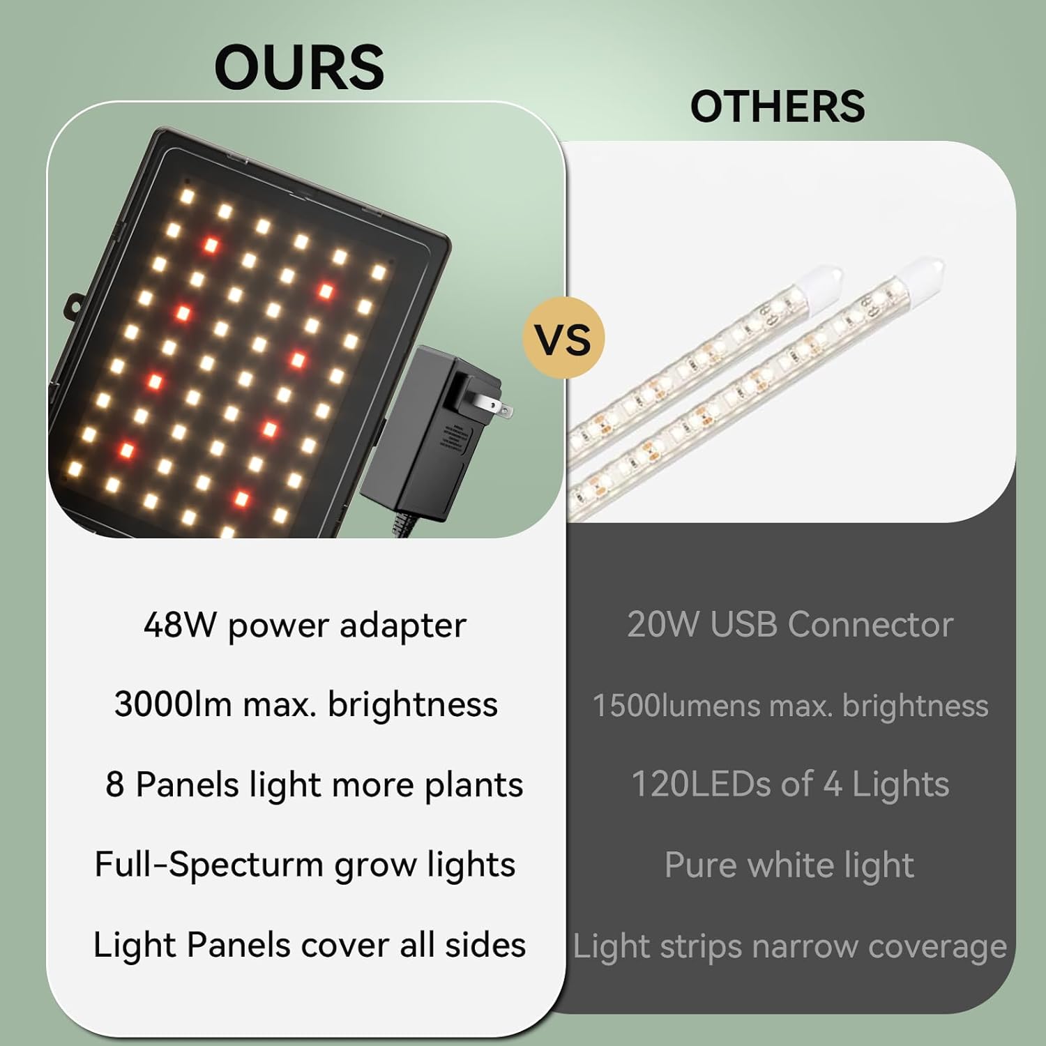 - 【More Lights, Greater Brightness】Our grow lights come with a 12V 4A power adapter, offering a higher max power output of 48W compared to other plant lights with a 5V 2A USB connector, allowing for increased brightness across multiple lights. In contrast to plant shelves with only 4 lights, our stand is fitted with 8 panel lights, accommodating more layers of plants to bask in ample sunlight.