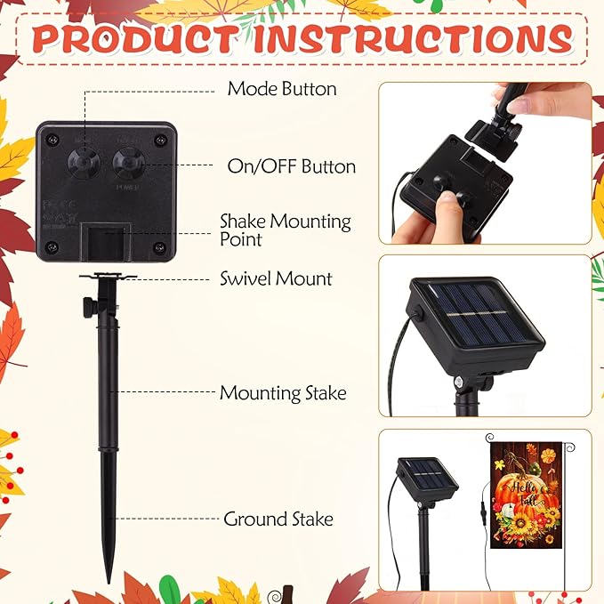 - Suitable Quantity: this set of 12 styles of outdoor garden flags comes with a solar cell ground plugs, a solar panel, about 20-24 LED lights on each flag, powered by solar energy, avoid expensive electricity bills; ( Note: flagpole is not included)