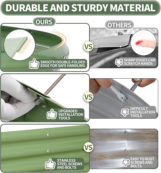 - 【High-Quality Materials & Durable】 Made from 0.7mm galvanized metal panels with double-layer anti-corrosion galvanization, this outdoor raised garden bed features a robust oval-shaped design for added strength and durability. Resistant to rust and corrosion, it provides a long-lasting gardening solution that can be reused for many years, ensuring a sustainable and reliable space for your plants to thrive