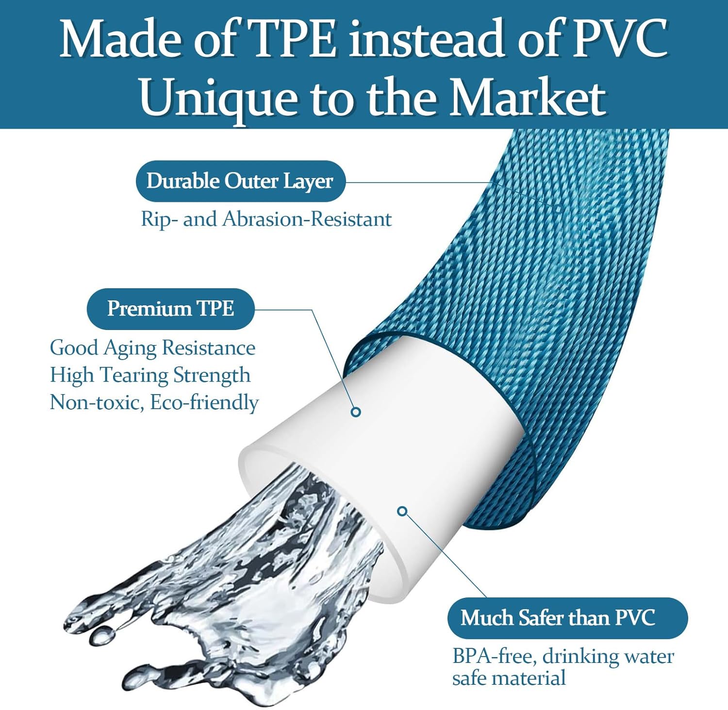 - [ All-Weather Flexibility ] Maintains flexibility down to -22 degrees Fahrenheit and can be used in temperatures up to 150 degrees Fahrenheit. Ordinary PVC hose has poor-resistance to low and high temperatures, and the hose loses performance under temperature changes, which can damage it. TPE's superior freeze-resistance provides durability to the hose.